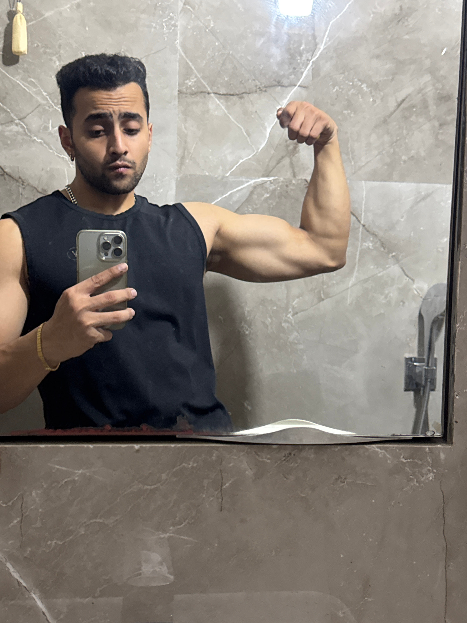 A man is posing in front of a mirror, flexing his bicep. He is wearing a black tank top and holding a smartphone in his right hand. The mirror reflects a bathroom setting with grey marble tiles. The l…read more