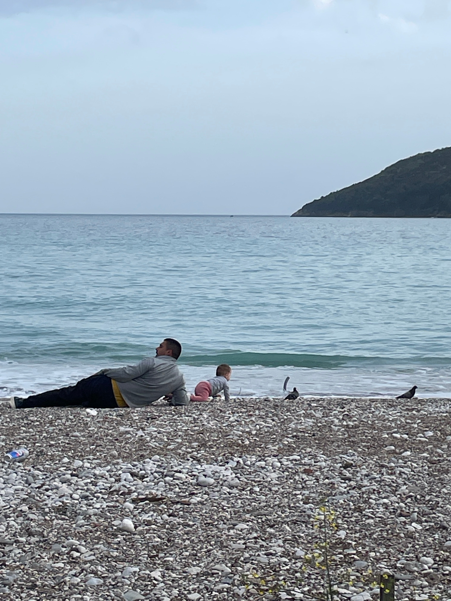 On a pebble beach in Budva, Montenegro, a man in a grey jacket and dark trousers stands near the water's edge, seemingly observing the ocean. A child in a pink outfit is nearby, also close to the wate…read more