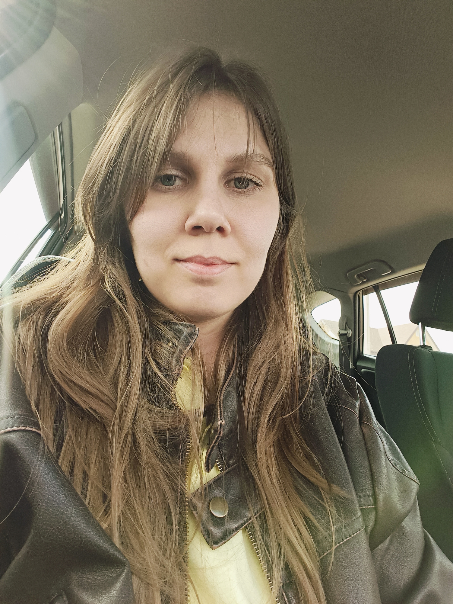 A close-up portrait depicts a female individual seated in the front of a car during daytime. She has long, wavy, light brown hair that cascades over her shoulders and frames her face. Her eyes are lig…read more
