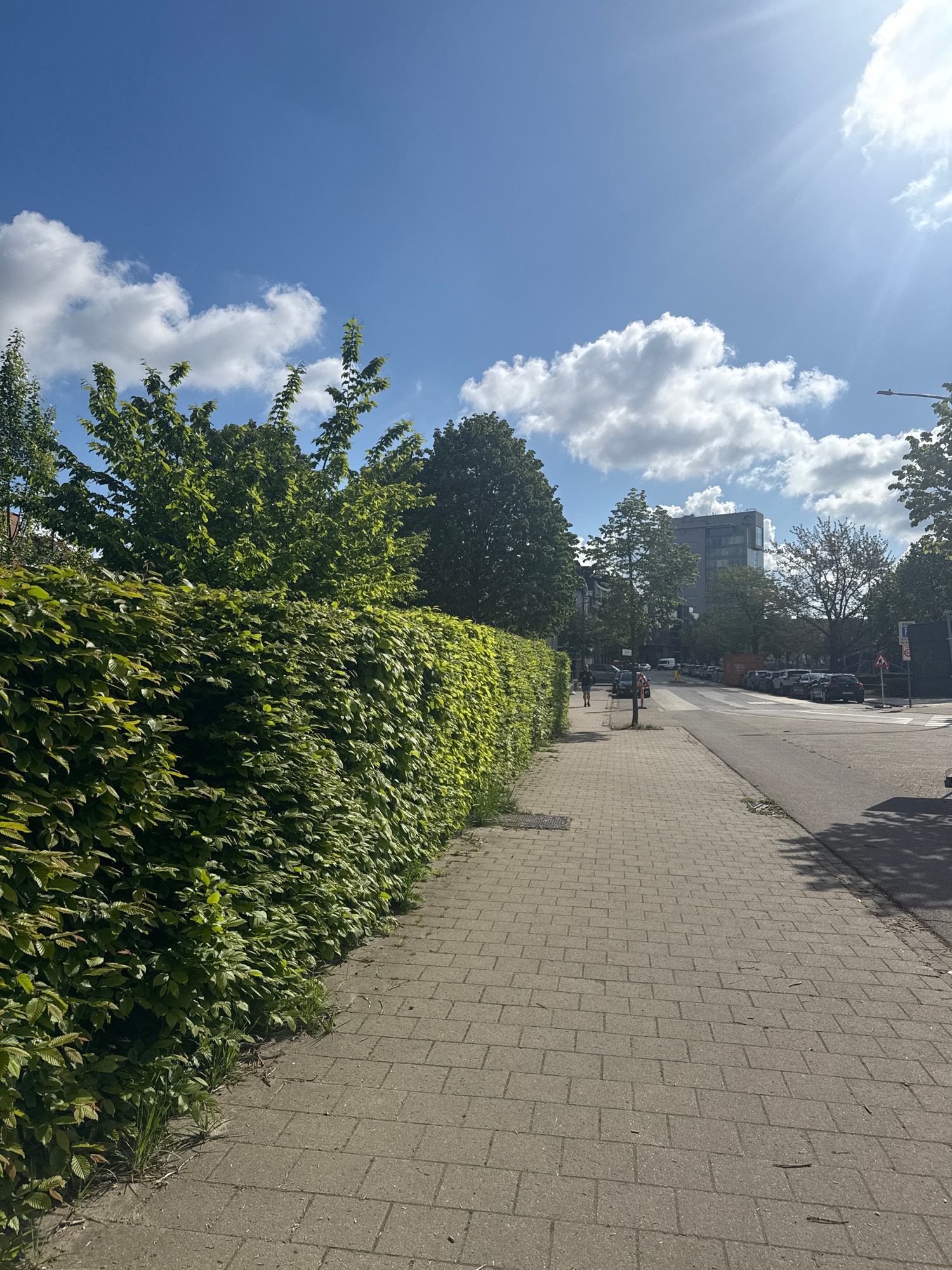 The image shows a street scene in Antwerp, Belgium. A brick sidewalk runs along the right side of the frame, bordered by a dense, green hedge on the left. Beyond the hedge are trees and a building. In…read more