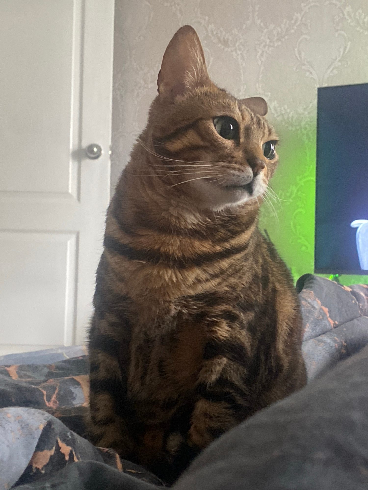 A domestic cat with striking brown and black tabby, spotted, and marbled fur patterns is the primary subject, resting indoors. The cat is positioned horizontally in the frame, with its head turned to…read more