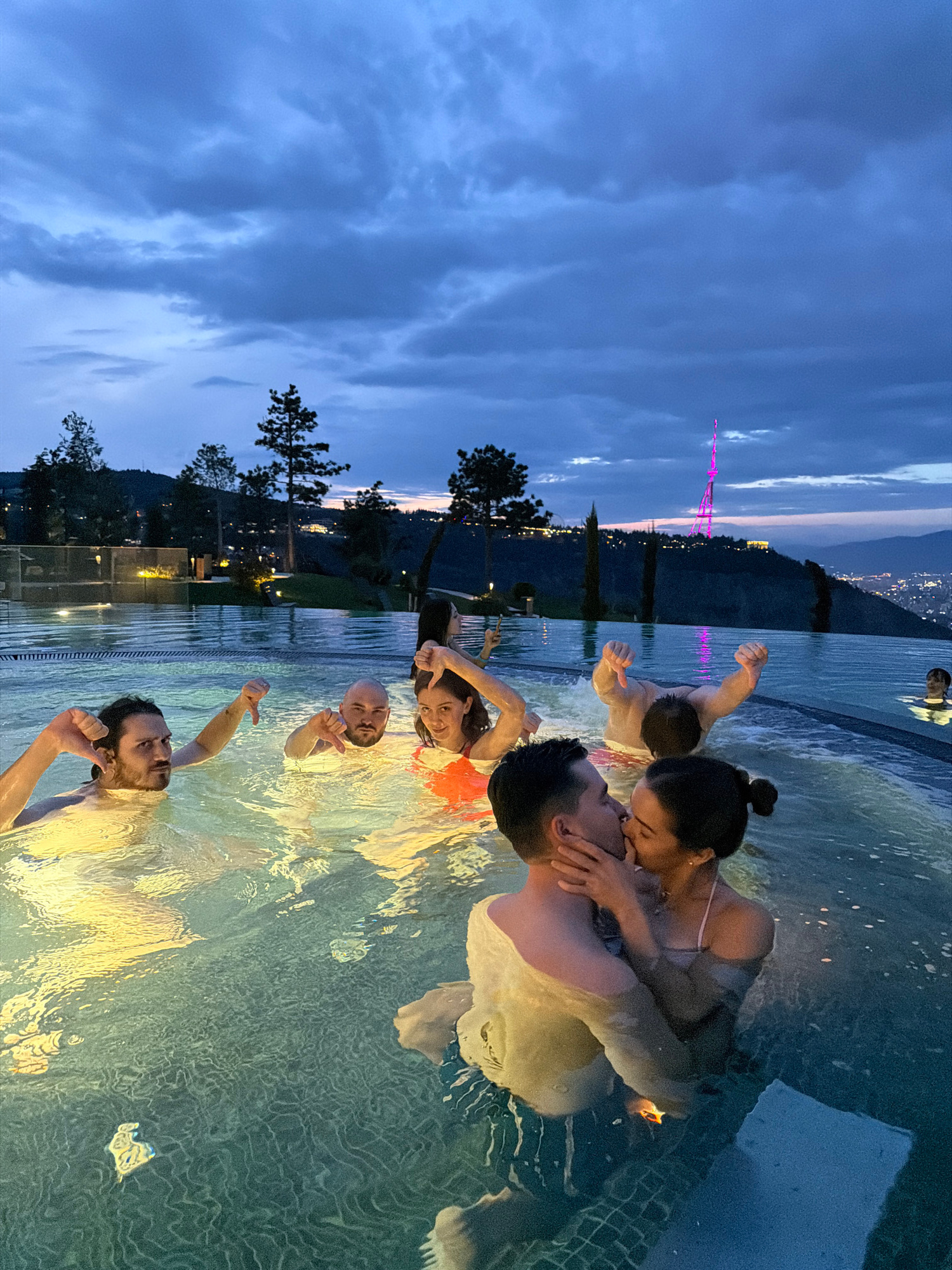 A horizontal, eye-level outdoor photograph depicts a group of six people enjoying an evening swim in an infinity pool. A couple is kissing in the foreground, with the woman wearing her hair up in a bu…read more