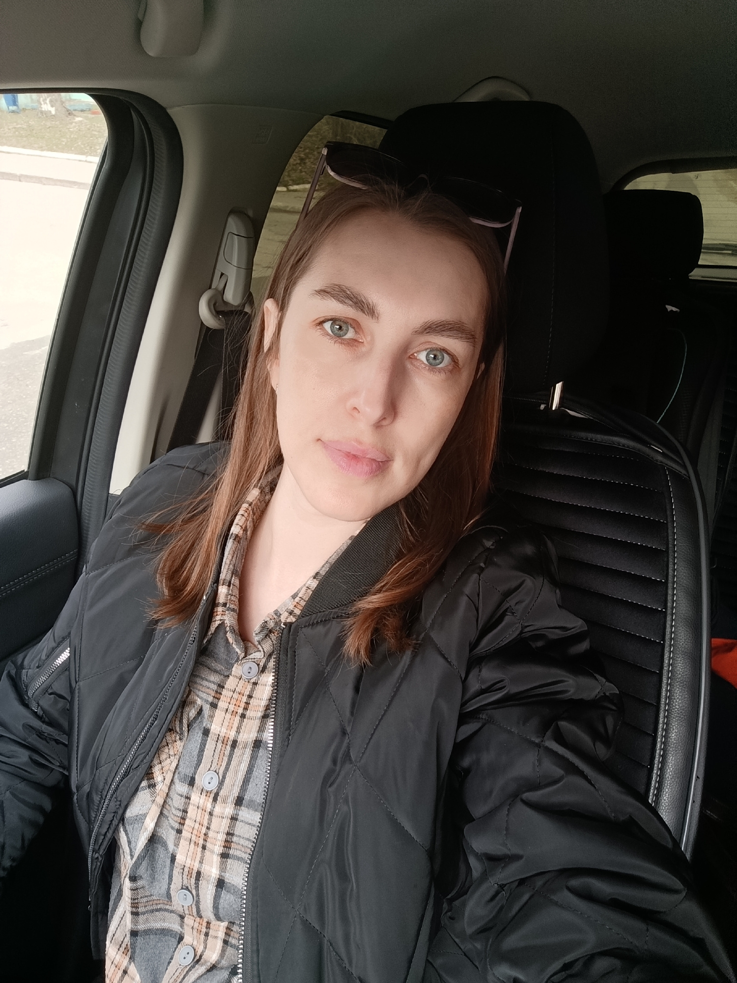 A woman is depicted sitting in the front seat of a car, looking directly at the camera. She has long, reddish-brown hair and light blue or blue-green eyes, with a neutral expression. She is wearing a…read more