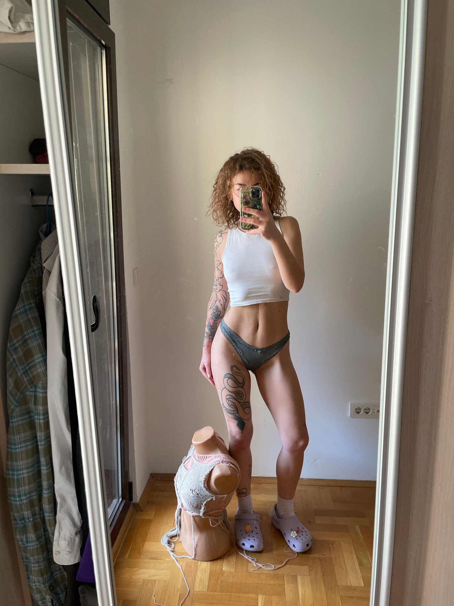 An individual with reddish-brown curly hair is depicted in a full-length mirror selfie within an indoor residential setting in Boreti, Montenegro. The individual, appearing female, stands centrally, h…read more