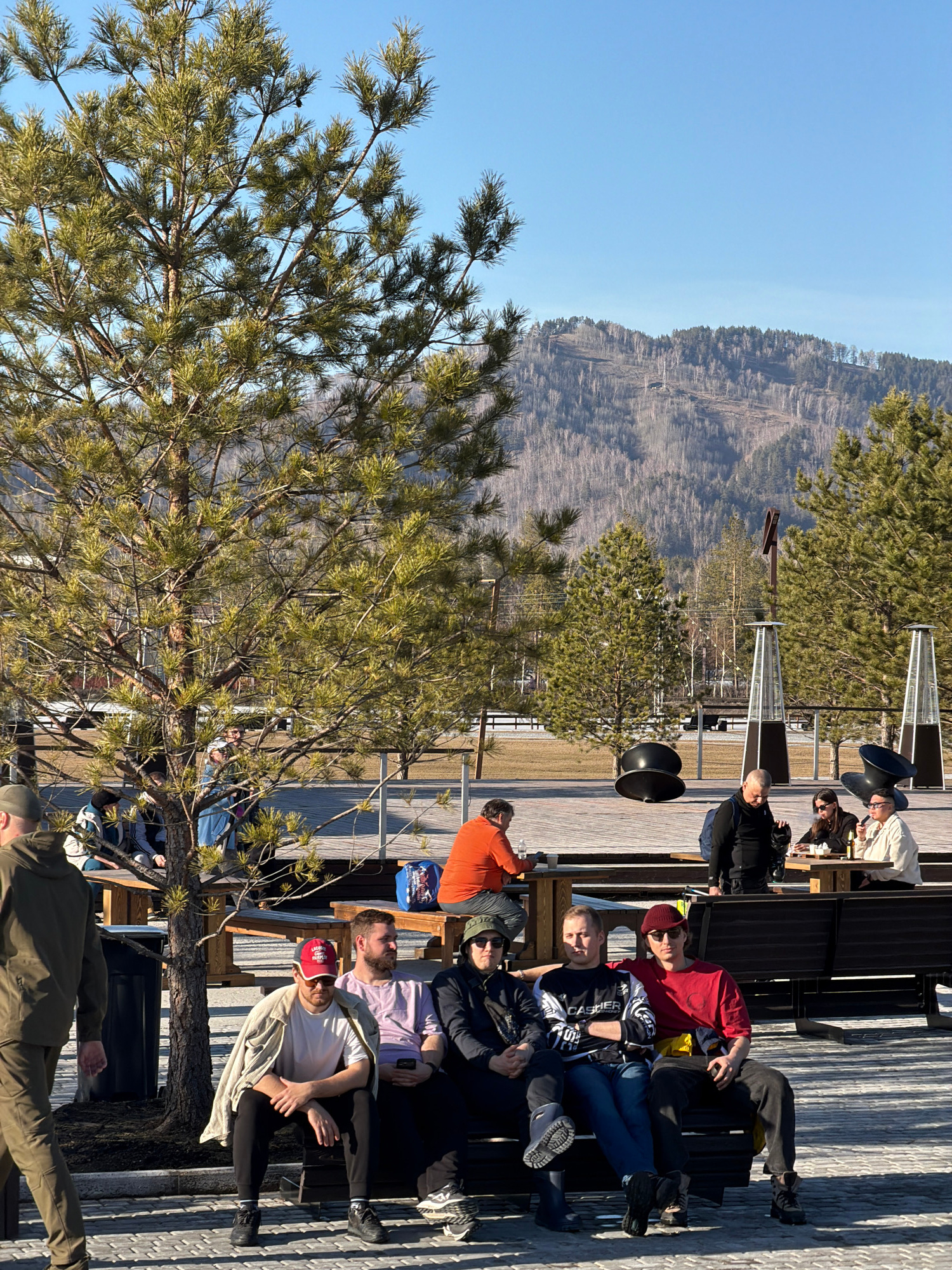 A group of approximately 14 people sit on benches on a wooden deck, overlooking a mountainous terrain under a clear blue sky. The scene is situated in Озёрное, Russia. The people are casually dressed…read more