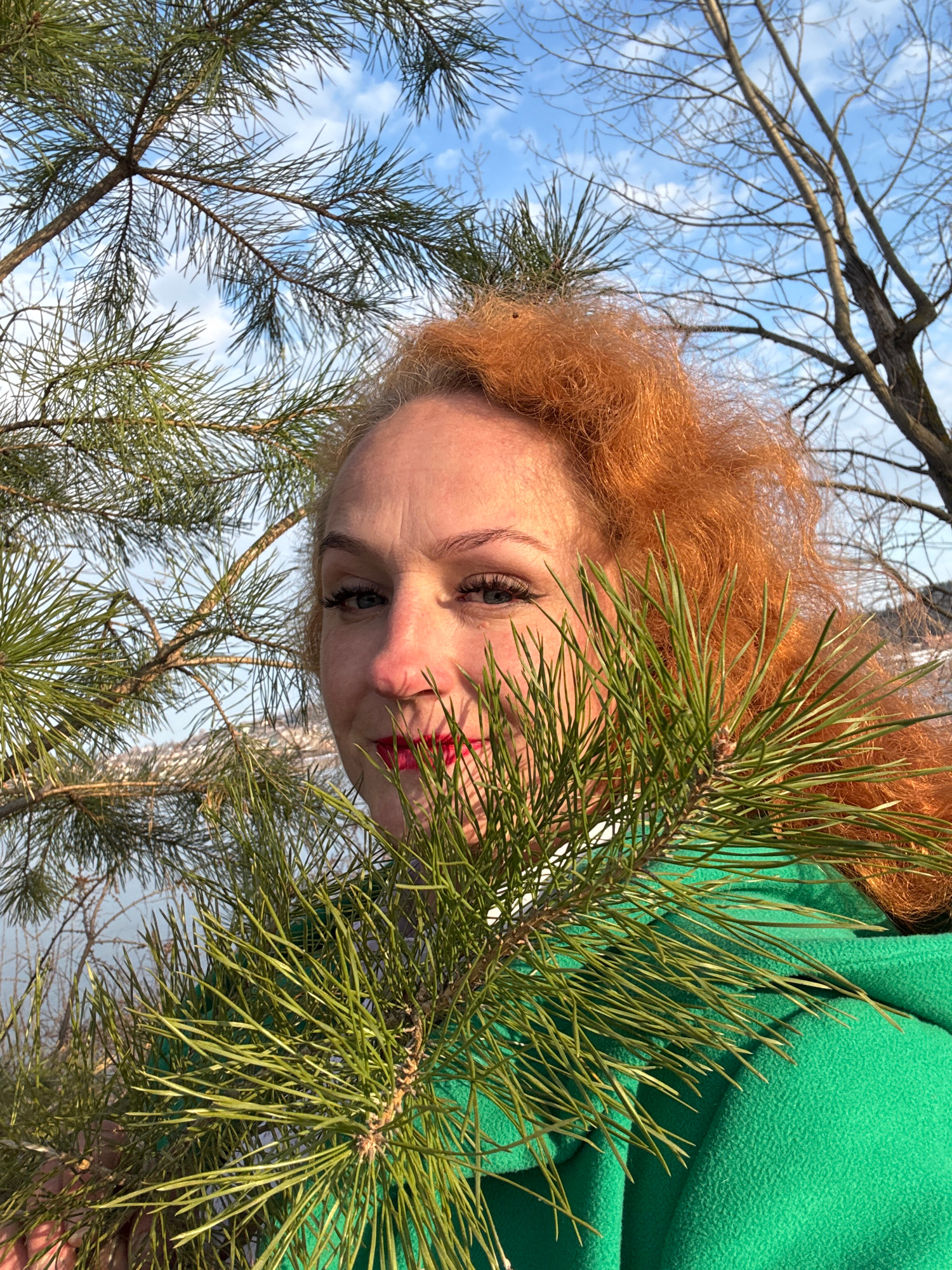 A low-angle, tilted shot depicts a woman with red hair, positioned behind pine branches. She wears a green garment, potentially a coat or jacket. Her face is visible between the pine needles, and sheβ¦read more