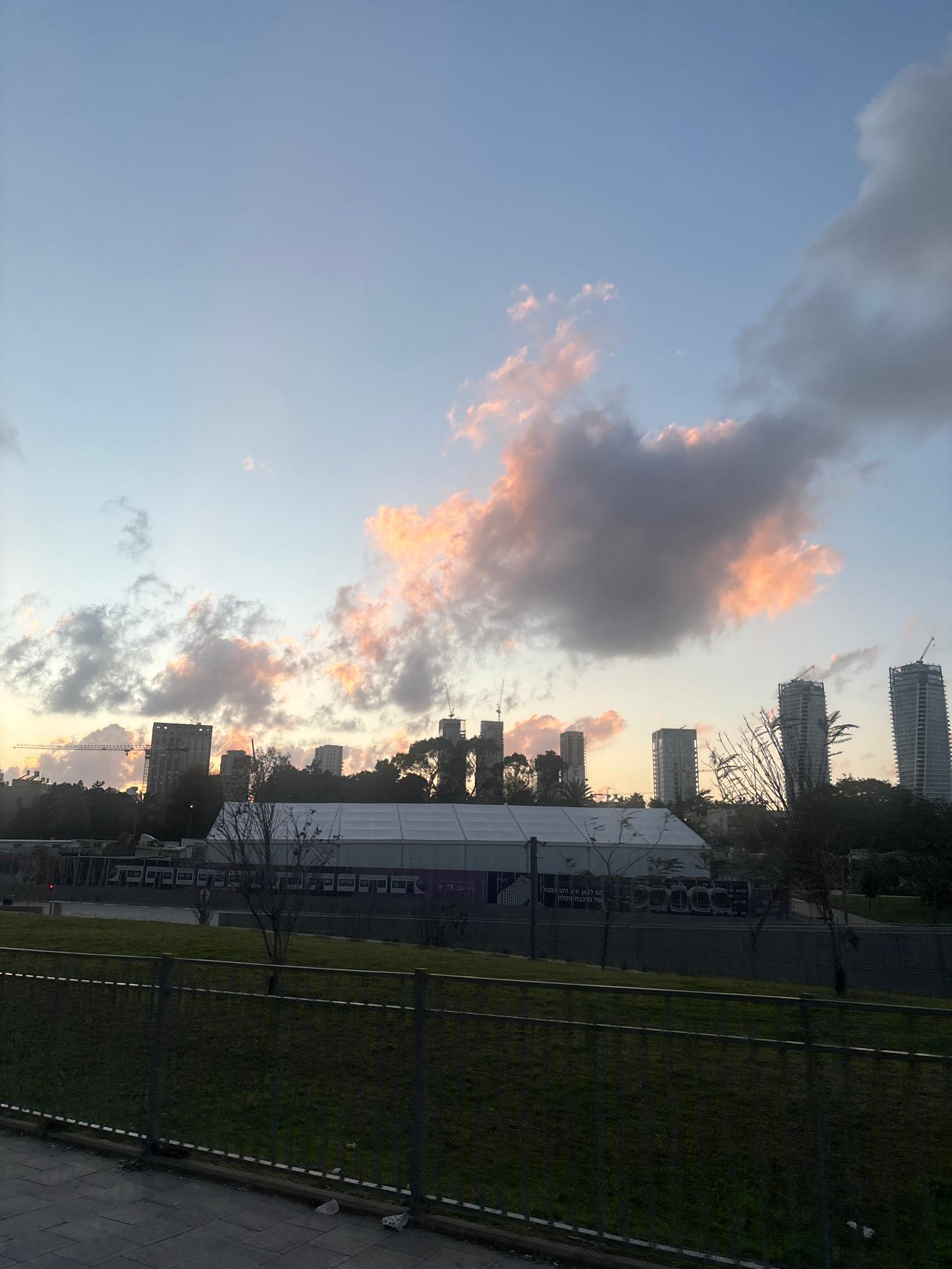 The image shows a sunset view in Ramat Gan, Israel. Several high-rise buildings are under construction, with cranes visible. A large, long, white temporary structure sits on the right side of the imag…read more