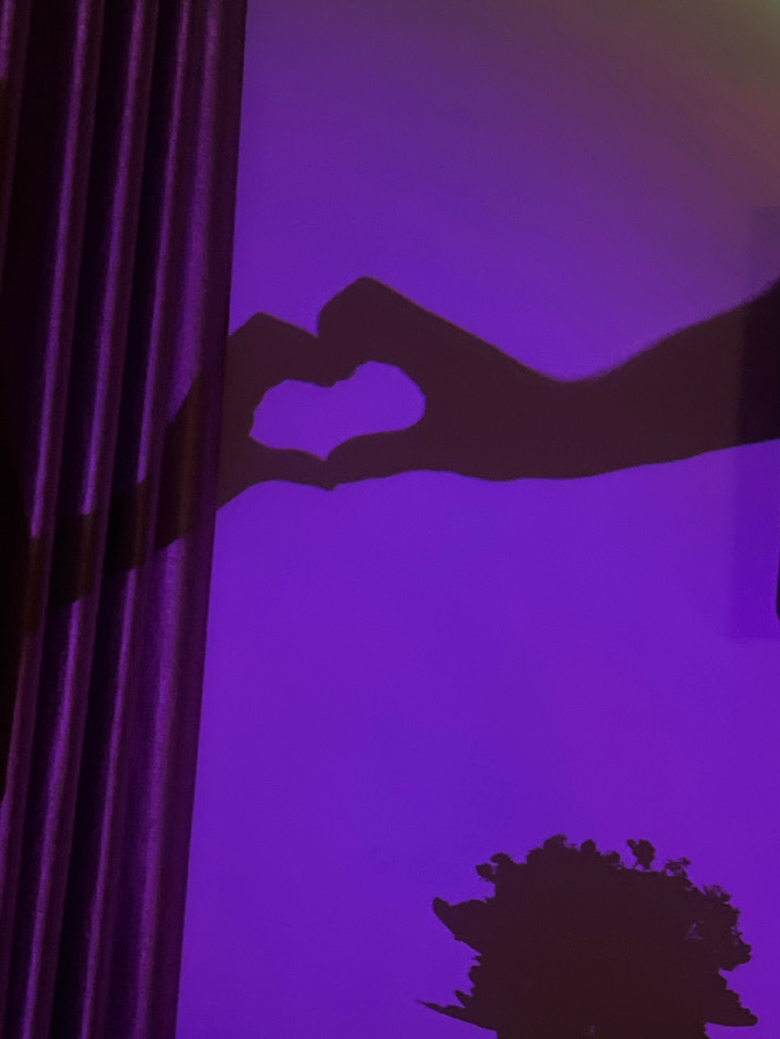 The image displays an indoor scene in Nha Trang, Vietnam, characterized by a dominant purple illumination. A dark shadow of two hands forming a heart shape is centrally cast upon a vibrant purple wallβ¦read more