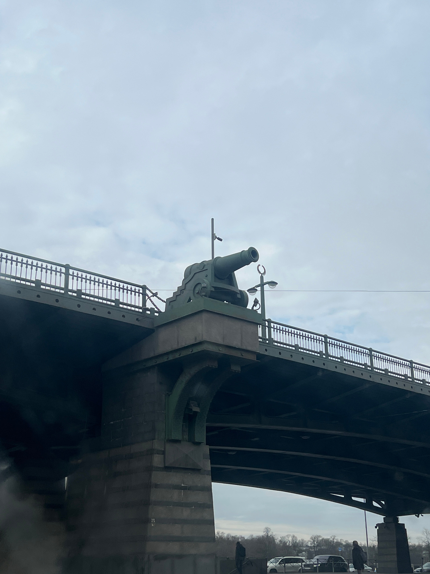 The image shows a section of the Liteyny Bridge in Saint Petersburg, Russia. A decorative cannon is mounted on one of the bridge's supports. The bridge structure is visible above and to the right of t…read more
