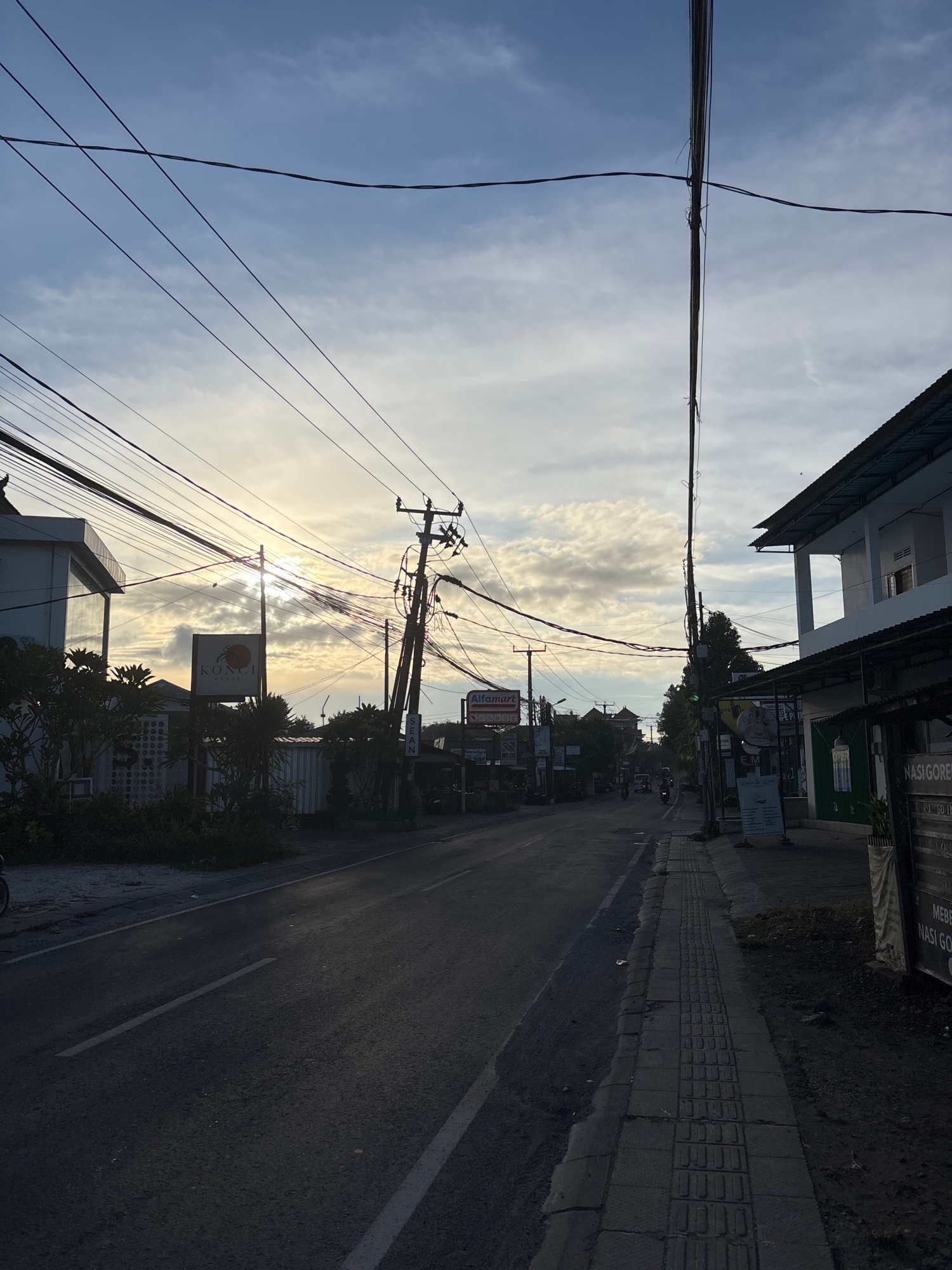 The image depicts a street scene in Ungasan, Indonesia. The view is along a narrow road with buildings lining both sides. Overhead, a dense network of power lines crisscrosses the sky, partially obscu…read more