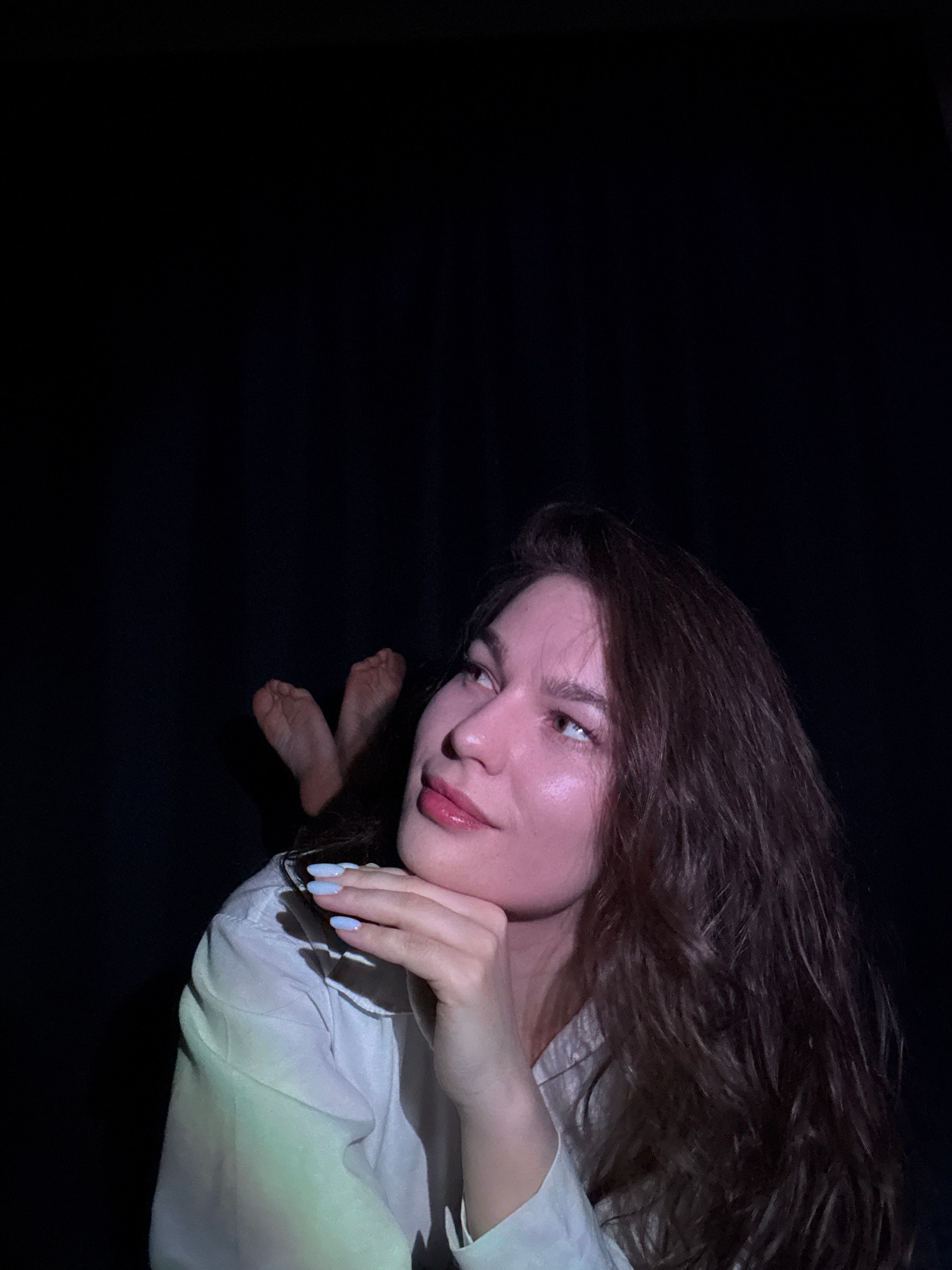 A young woman with long brown hair and fair skin is positioned in the upper right quadrant of the image, set against a dark background. She is wearing a white, collared shirt. Her face is illuminated,…read more