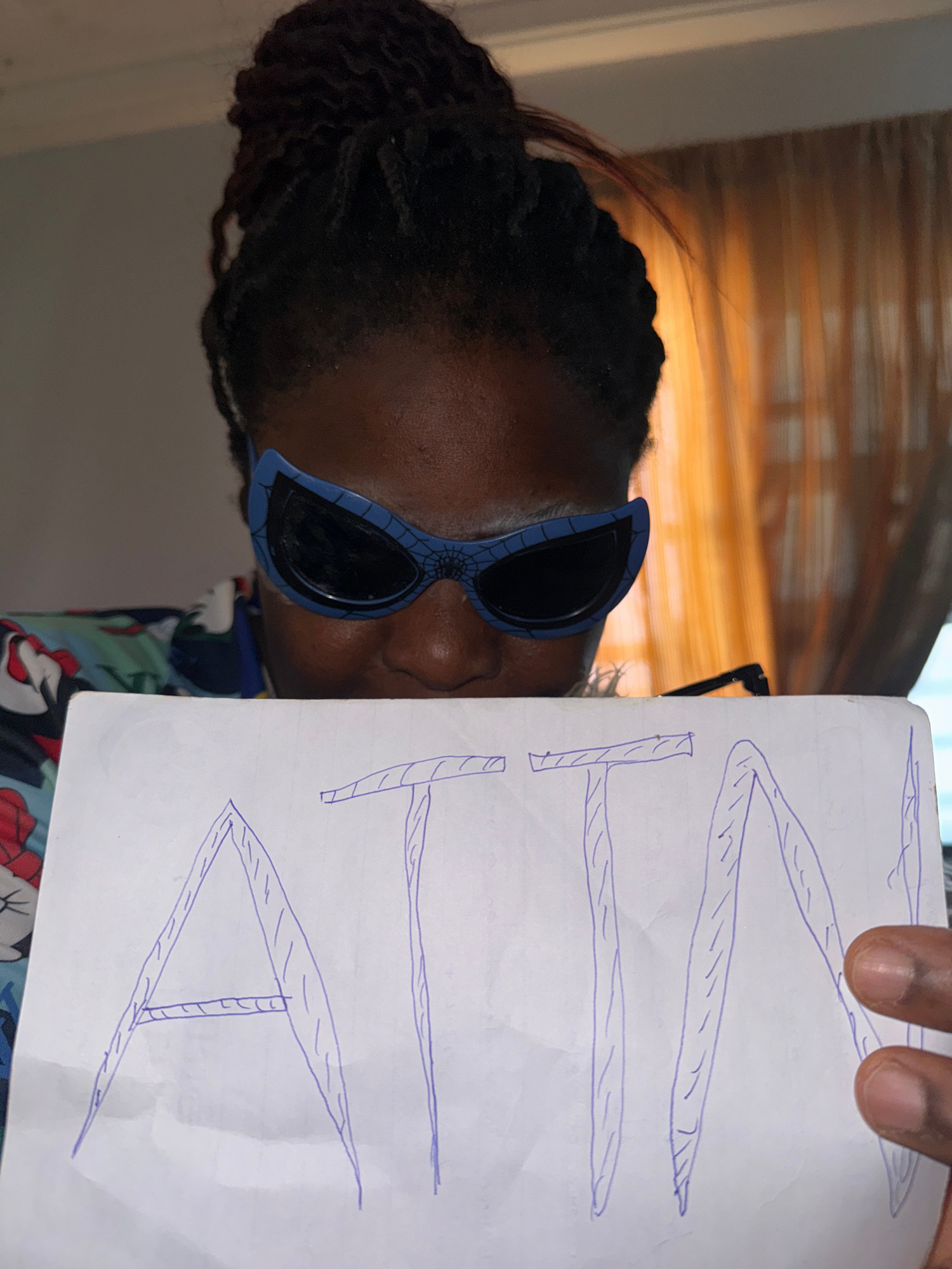 A person with dark hair and skin is holding a piece of white paper with a hand-drawn image of the letters "ATA" in blue ink. The person is wearing blue sunglasses with a spiderweb design. The backgrou…read more