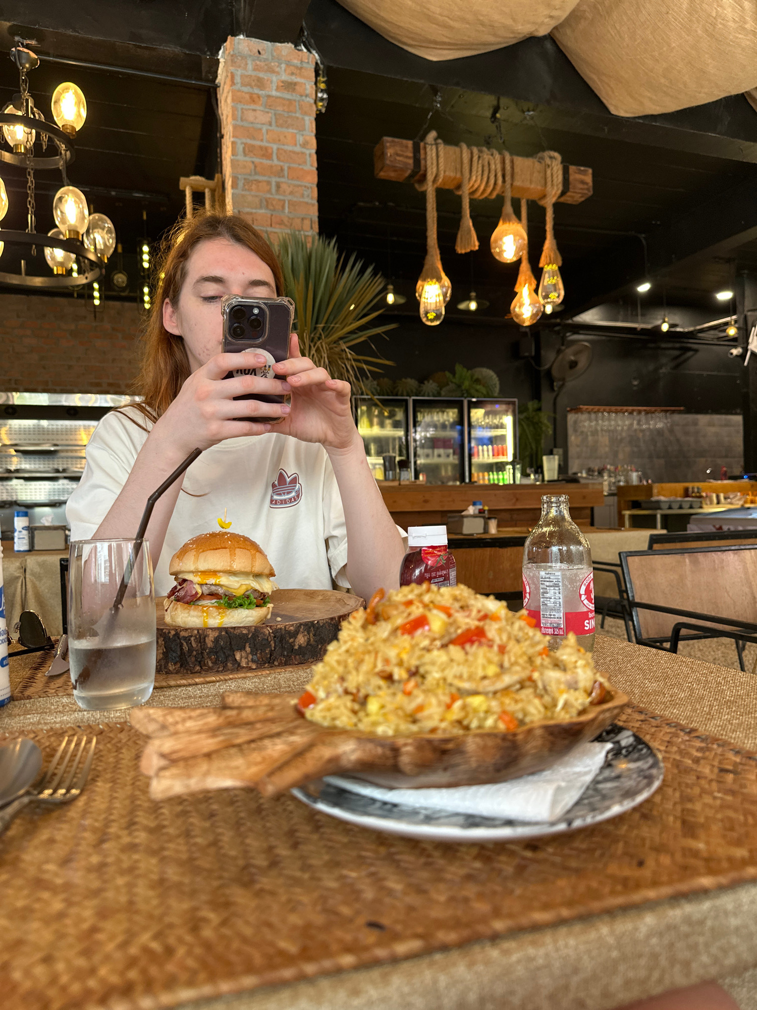 A person is shown taking a photo with their phone of a meal on a table in Baan Chaweng, Thailand. The table is covered with a textured mat and contains a plate of food, a hamburger on a wooden board,…read more