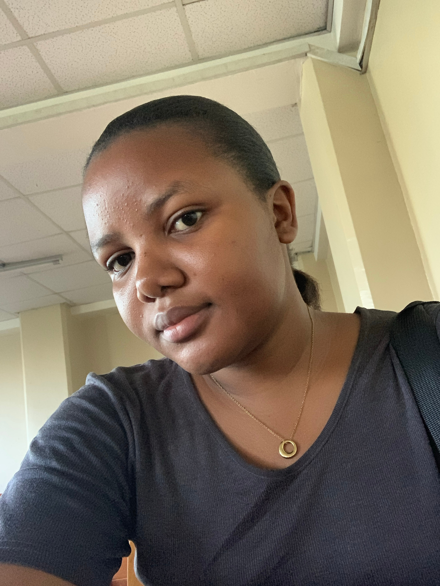 A close-up, rotated portrait-style selfie captures a young person with dark skin looking directly at the camera. Their dark hair is pulled back, revealing a clean hairline. The subject wears a dark-co…read more