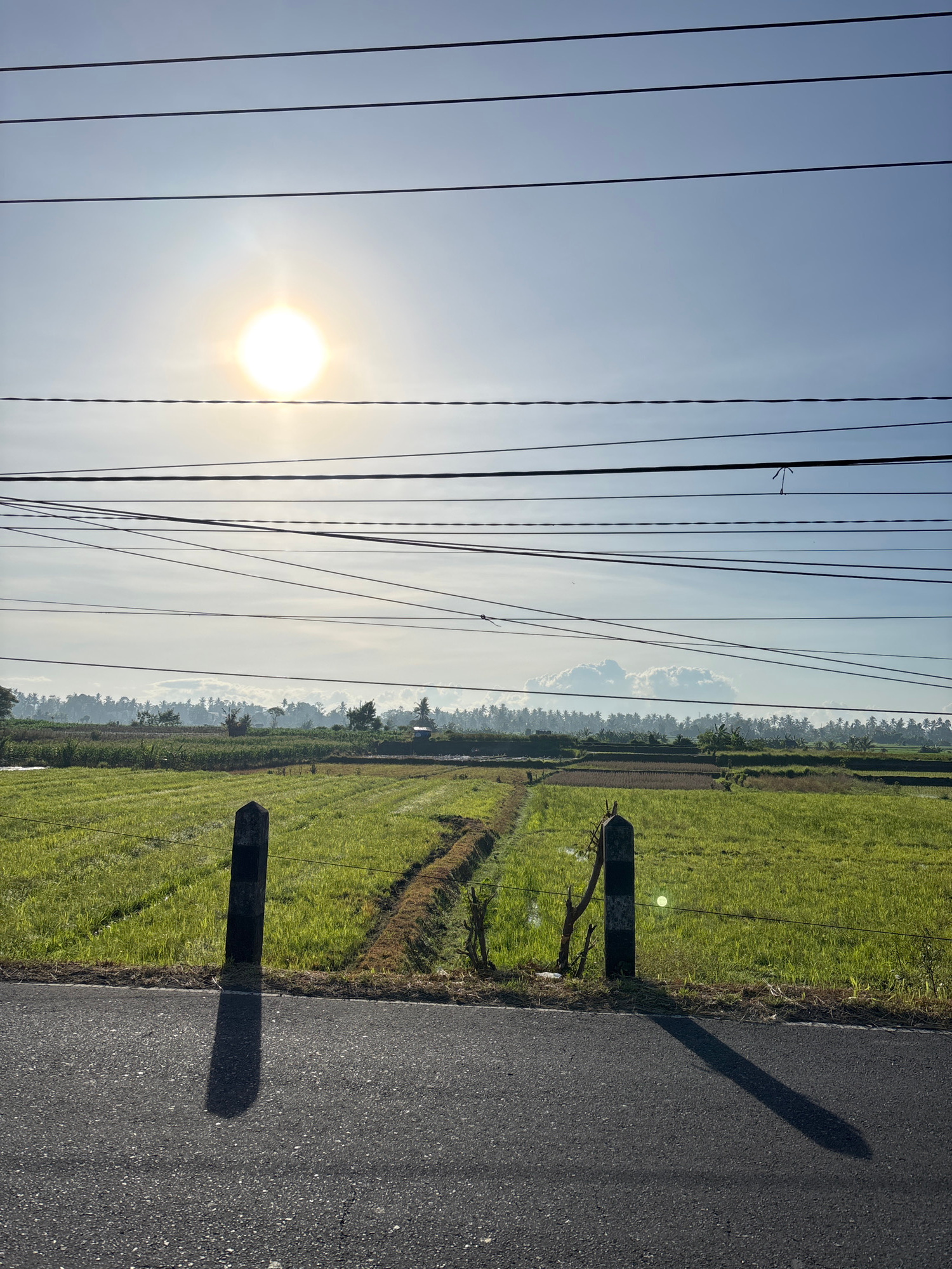 The image depicts a rural roadside scene in Abiansemal, Indonesia. The sun is low in the sky, shining through a network of overhead power lines that run across the upper left portion of the frame. Bey…read more