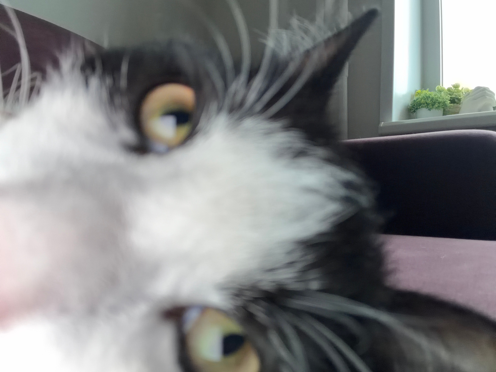 A close-up, slightly out-of-focus image depicts a black and white cat, its face occupying most of the frame. The cat's eyes, which are yellowish-green, are prominently visible. A window with a white f…read more