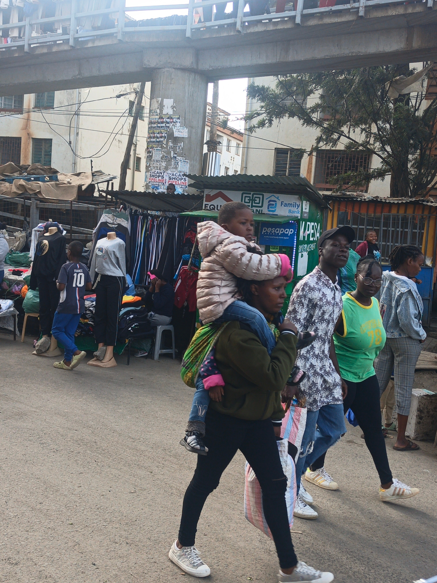 The image captures a vibrant street scene in Nairobi, Kenya. A woman carries a child on her shoulders as she walks along a busy street. The child wears a pink hat, a puffy jacket, and jeans, while the…read more