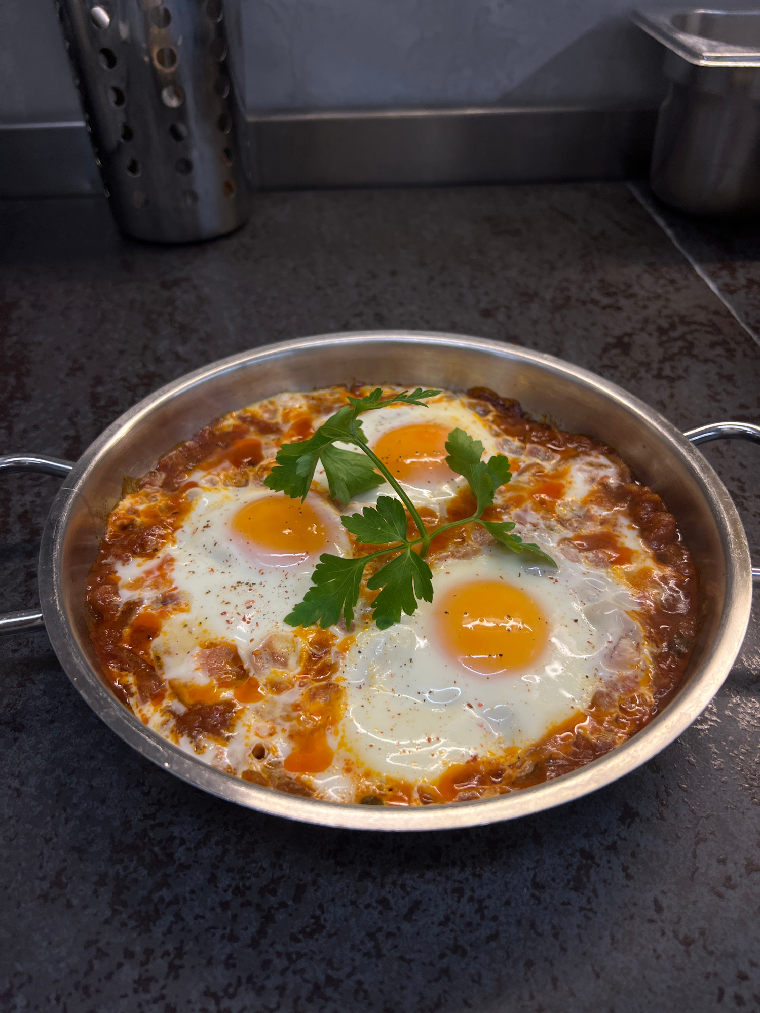 The image shows a silver-colored cooking pan with two loop handles, containing a dish of three sunny-side-up eggs nestled in a tomato-based sauce, garnished with a sprig of parsley. The pan sits on a…read more