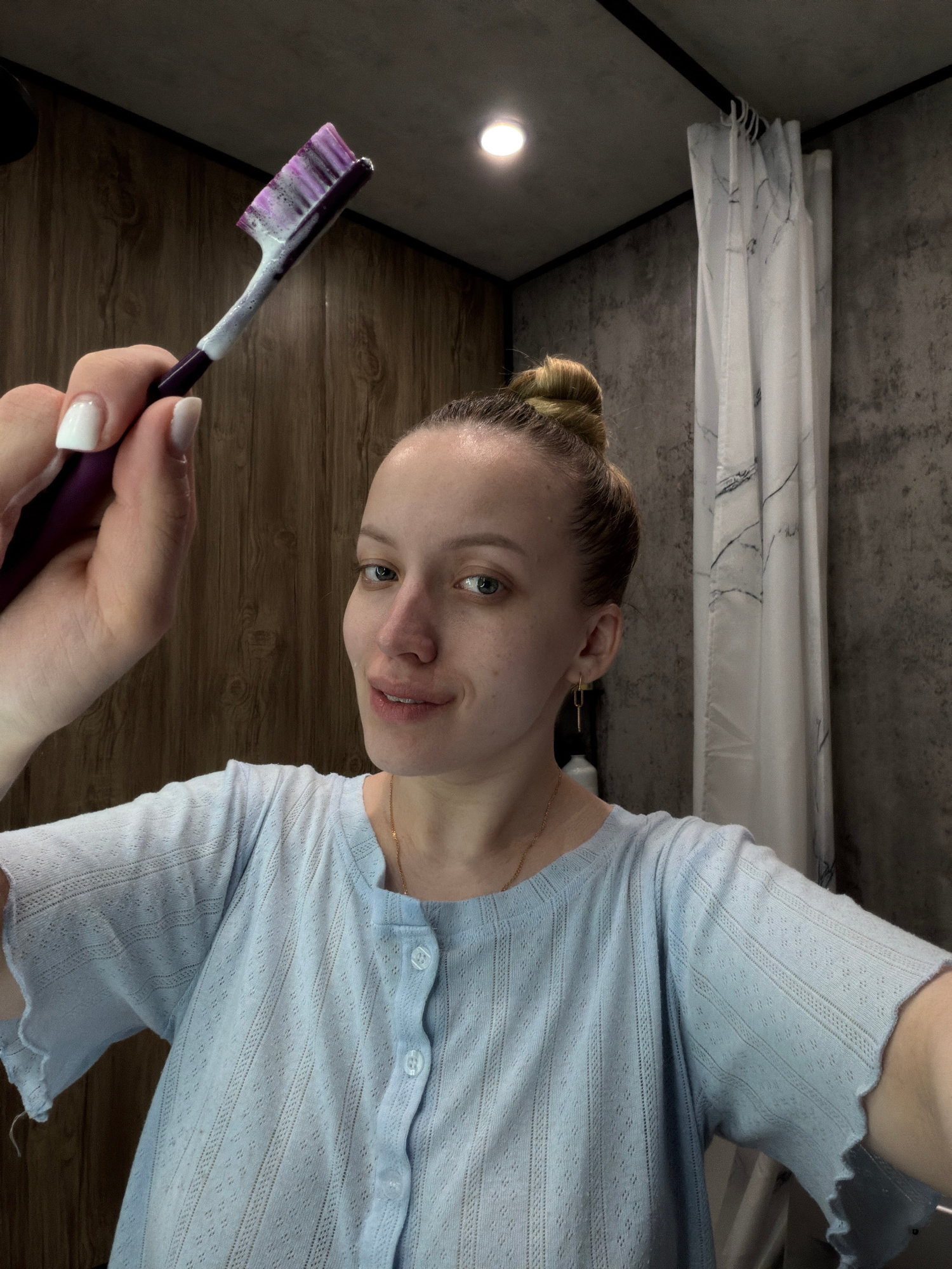 A woman is holding a toothbrush with toothpaste in what appears to be a bathroom. The woman has her blonde hair up in a bun. She is wearing a light blue button-up top. The bathroom has a shower curtai…read more
