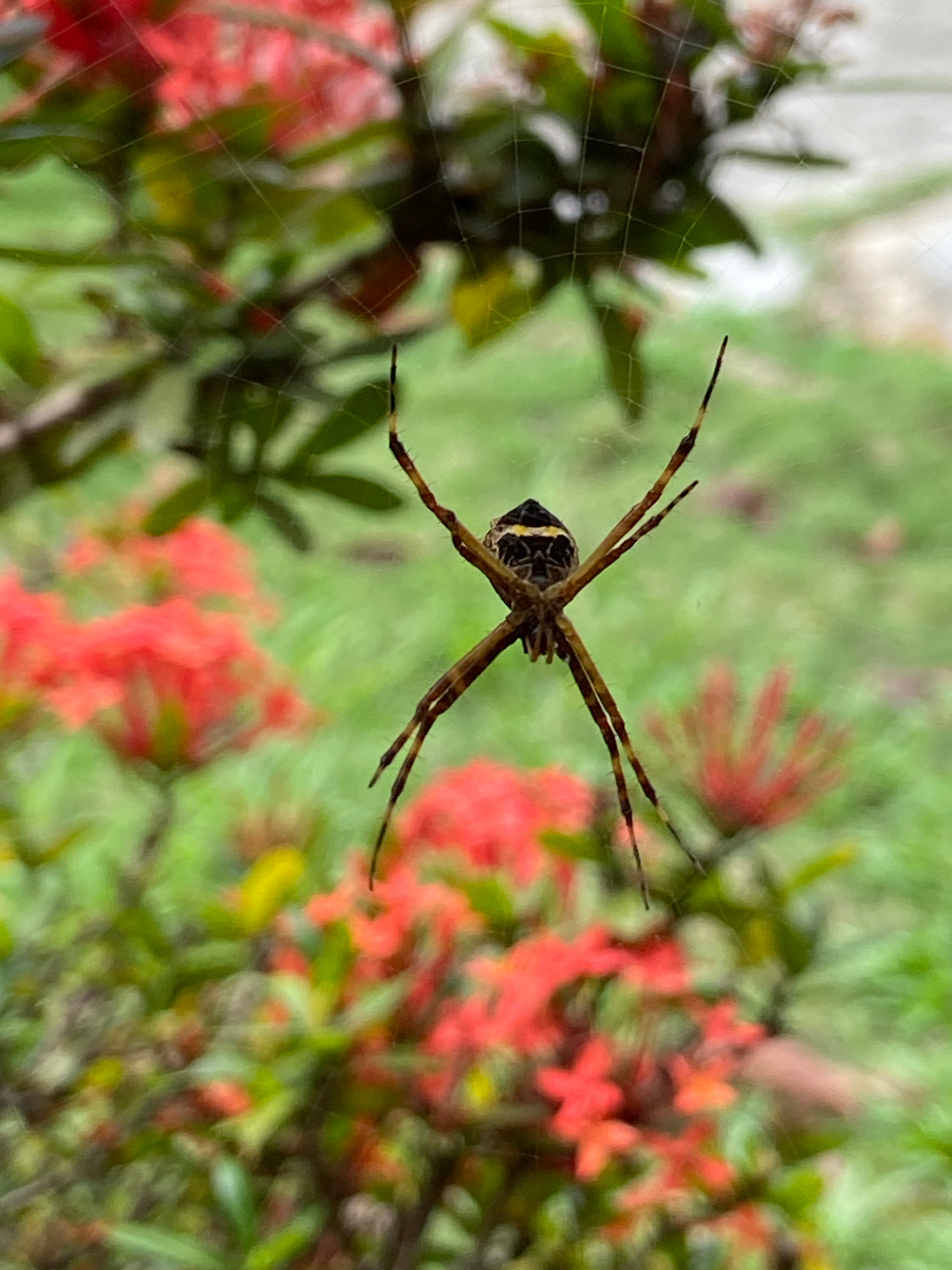 A spider with long, striped legs and a dark body sits in its web. The web is suspended between greenery and red flowering plants. The background is blurred, indicating a natural setting. The location…read more