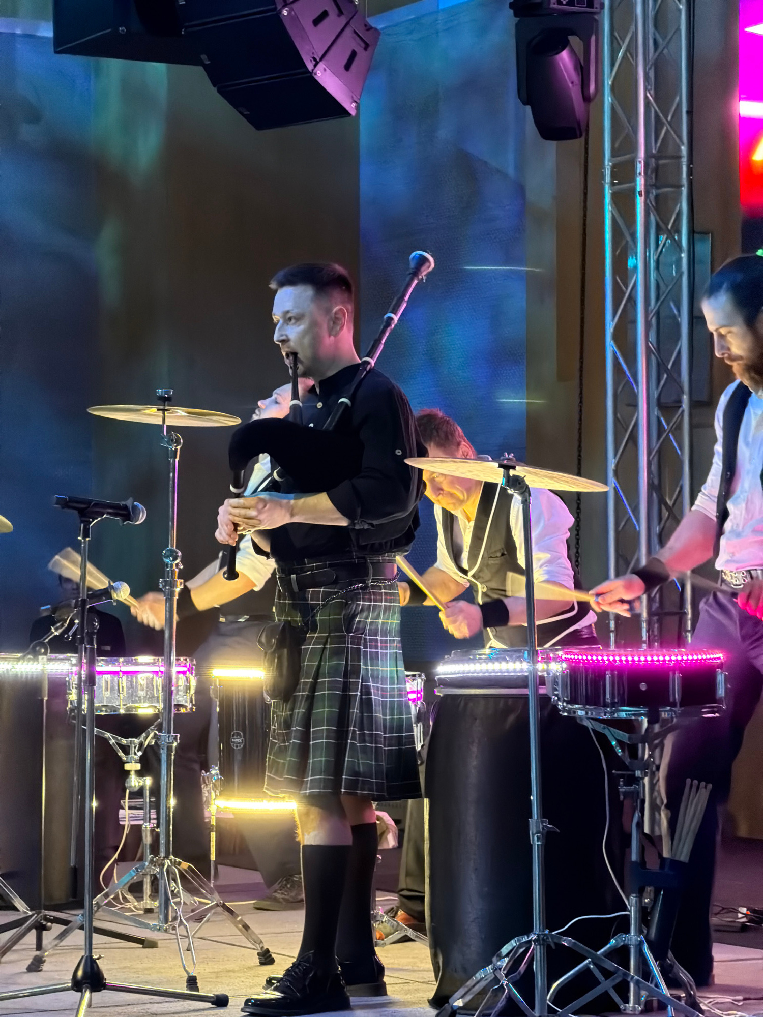 The image captures a musical performance likely in Moscow, Russia, featuring musicians playing bagpipes and drums. The musicians are dressed in attire that seems to be a blend of Scottish tradition wi…read more