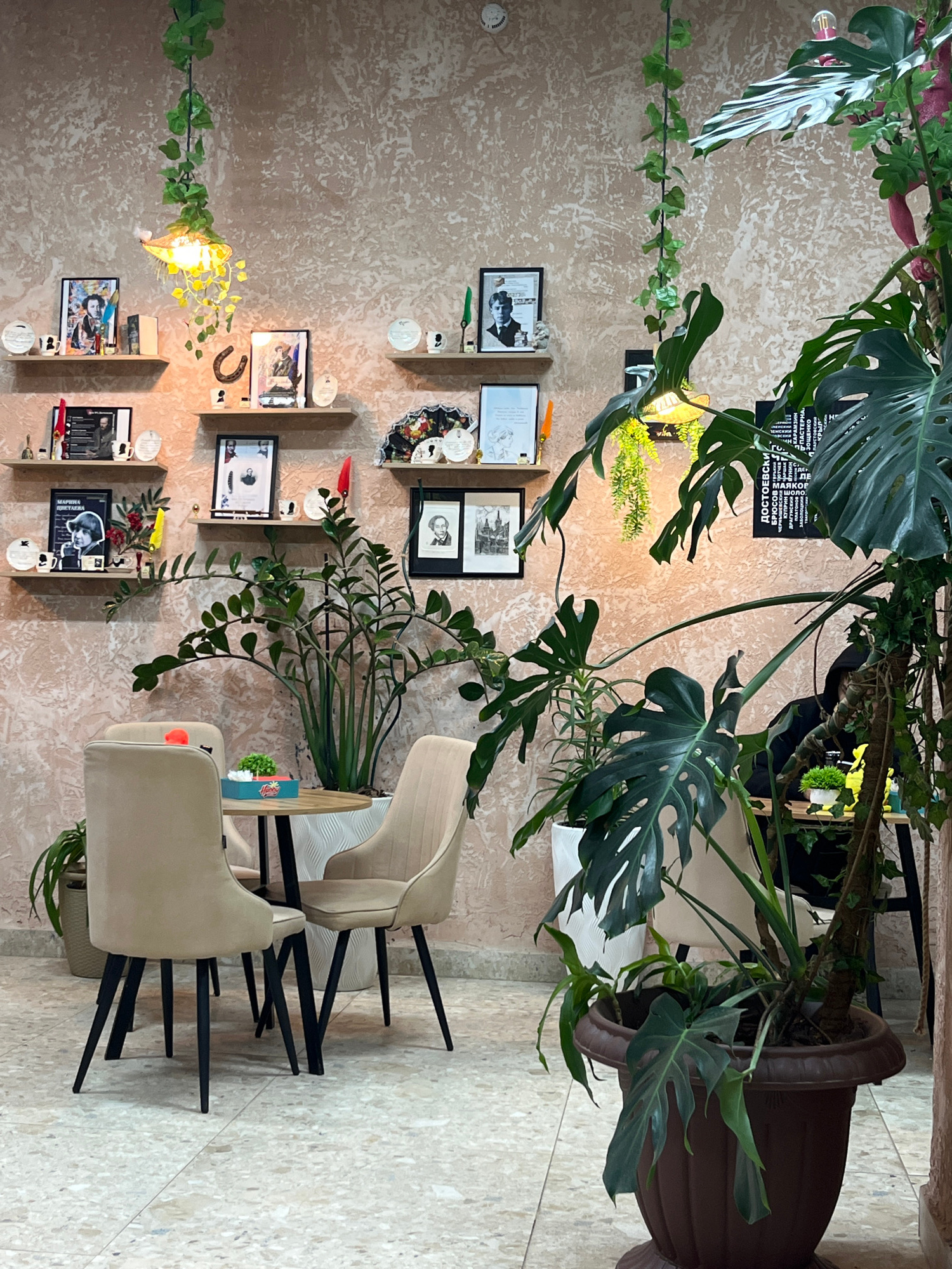 This media file captures a cozy, inviting interior space, likely a cafe or lounge, in Oktyabrsky, Russia. The scene is presented from a slightly elevated perspective, looking across the room. The set…read more