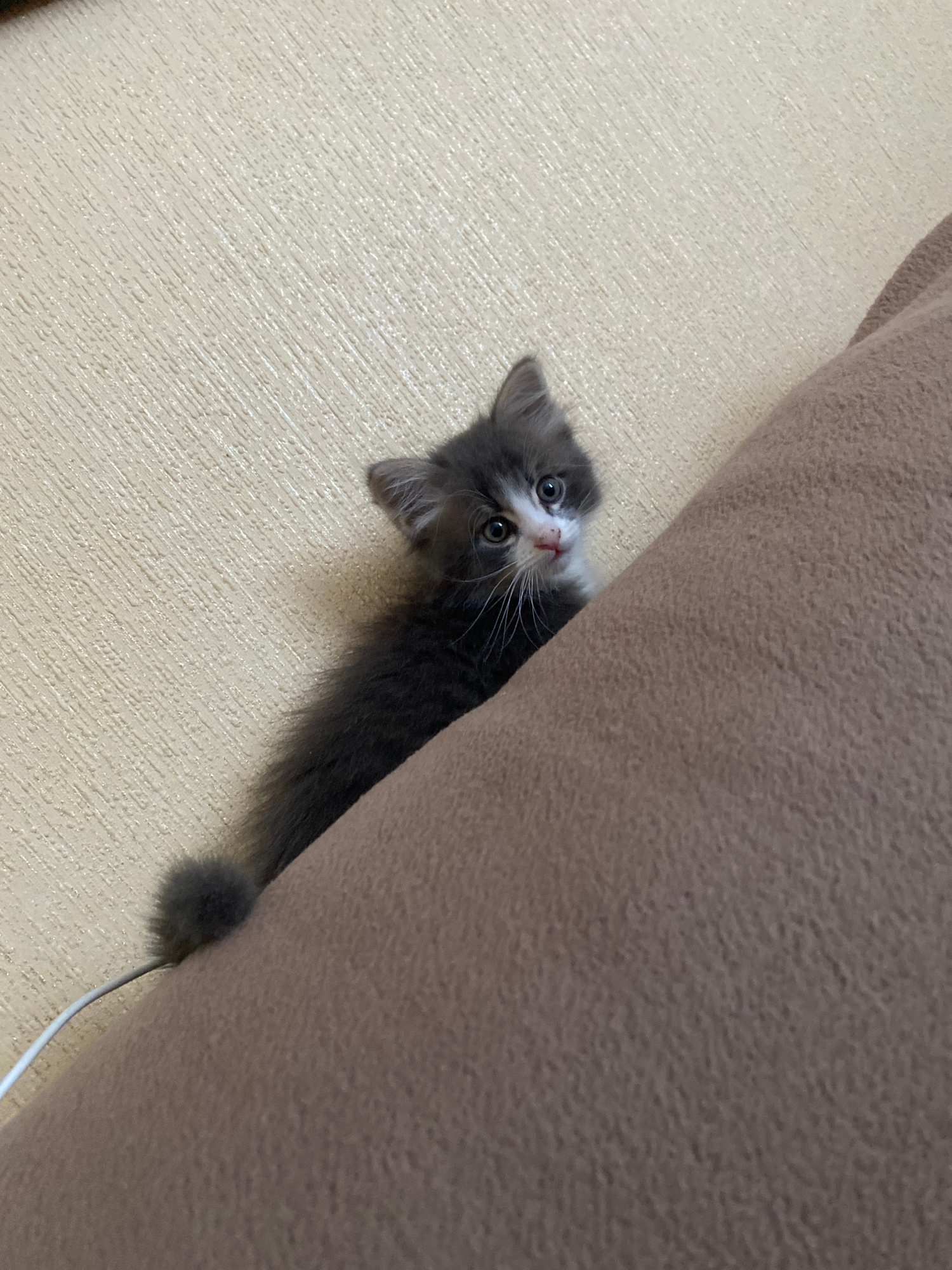 A small, fluffy kitten with grey and white fur and wide, curious eyes is peeking out from behind a large, brown or beige upholstered couch. The kitten's head and front paws are visible, angled upwards…read more