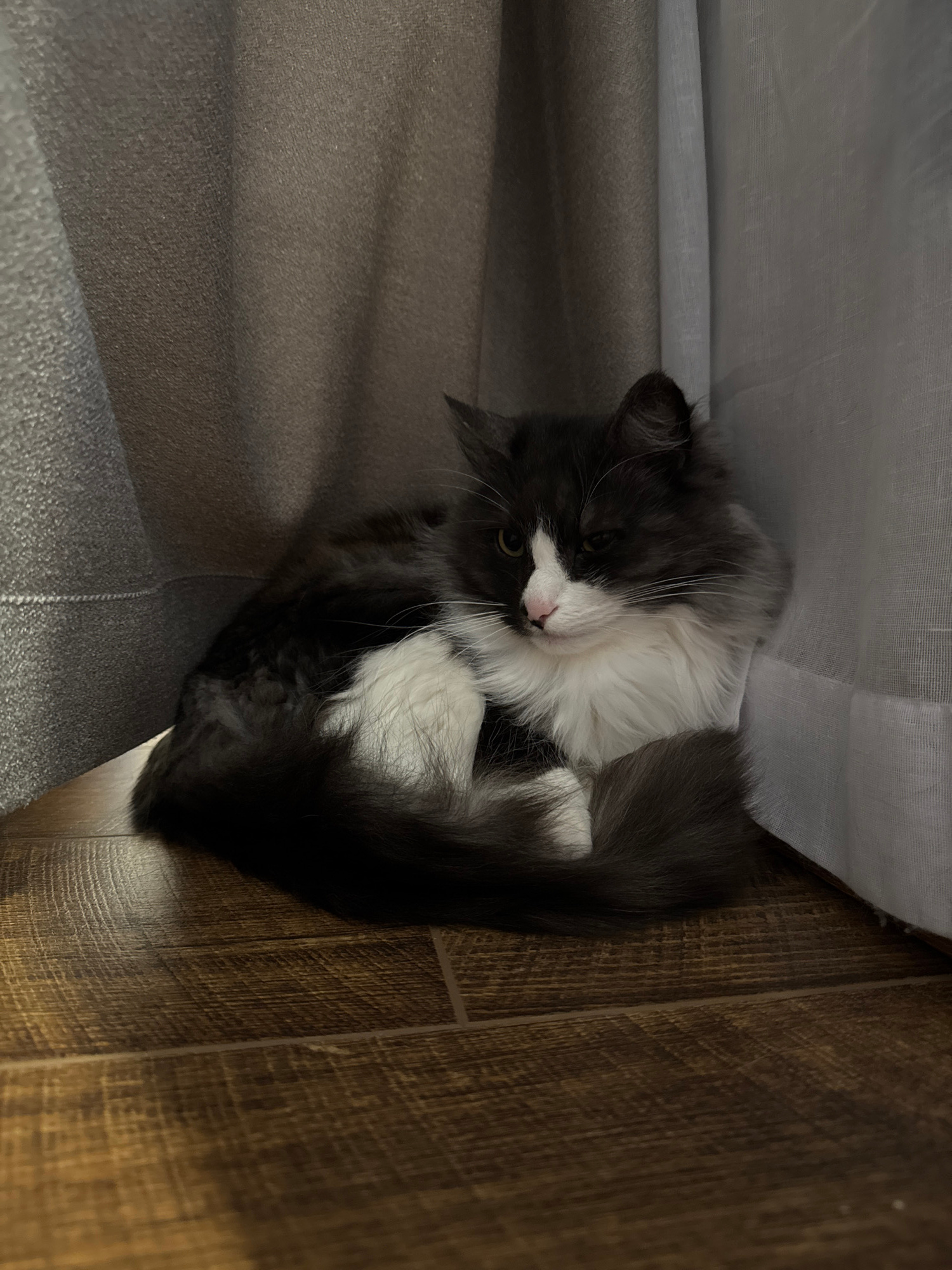 A gray and white cat is curled up on a gray fabric surface, likely a piece of furniture, next to a light-colored curtain and a brown wood-grain wall or floor. The cat is the main subject of the image.…read more