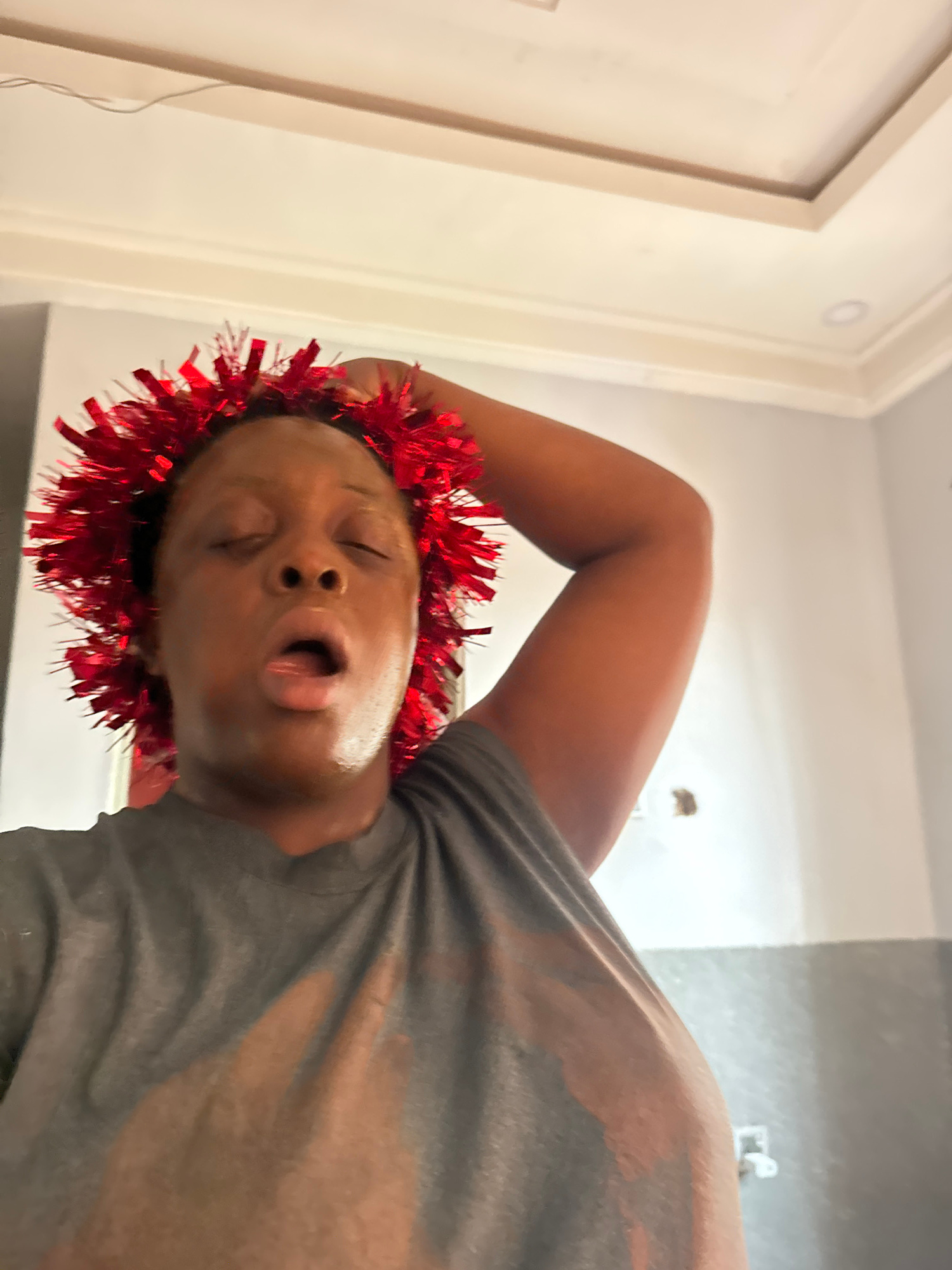 A person with dark skin is wearing a red tinsel garland around their head. Their head is tilted back and their mouth is open. They are wearing a gray t-shirt. The background includes a white door andβ¦read more