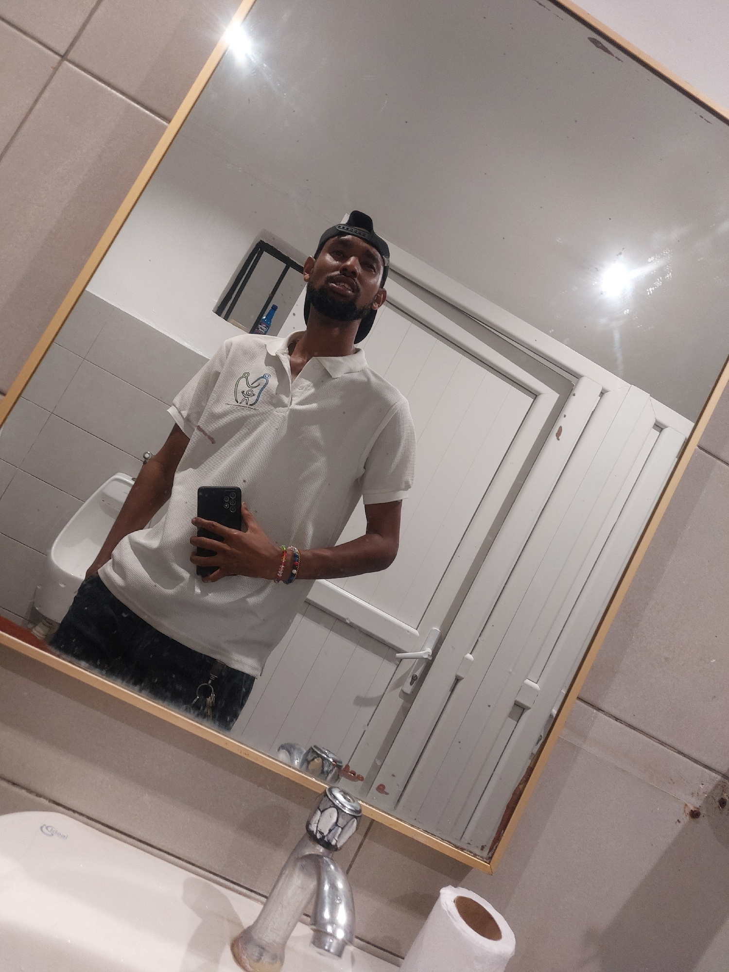 A man is reflected in a gold-framed mirror in a bathroom. He has dark skin, a beard, and wears a black cap. He is wearing a white polo shirt with a design on it, black pants, and beaded bracelets on h…read more