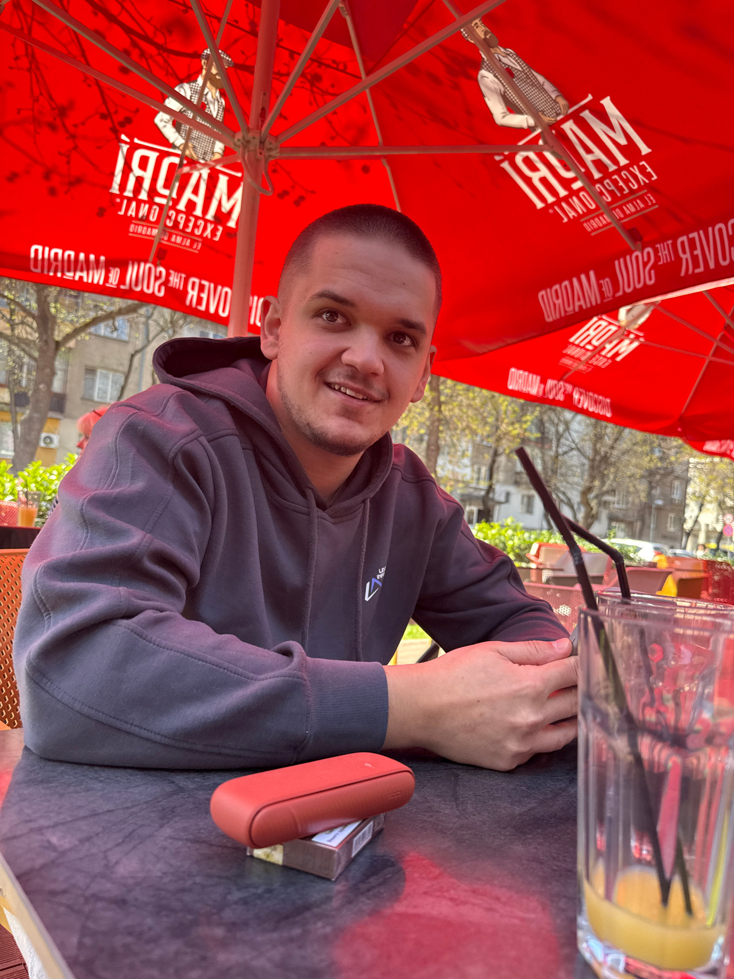 A medium, eye-level, angled shot of a man seated at an outdoor table. The man, who appears to be in his late 20s to early 30s, has short brown hair and is wearing a gray hooded sweatshirt. He is smili…read more
