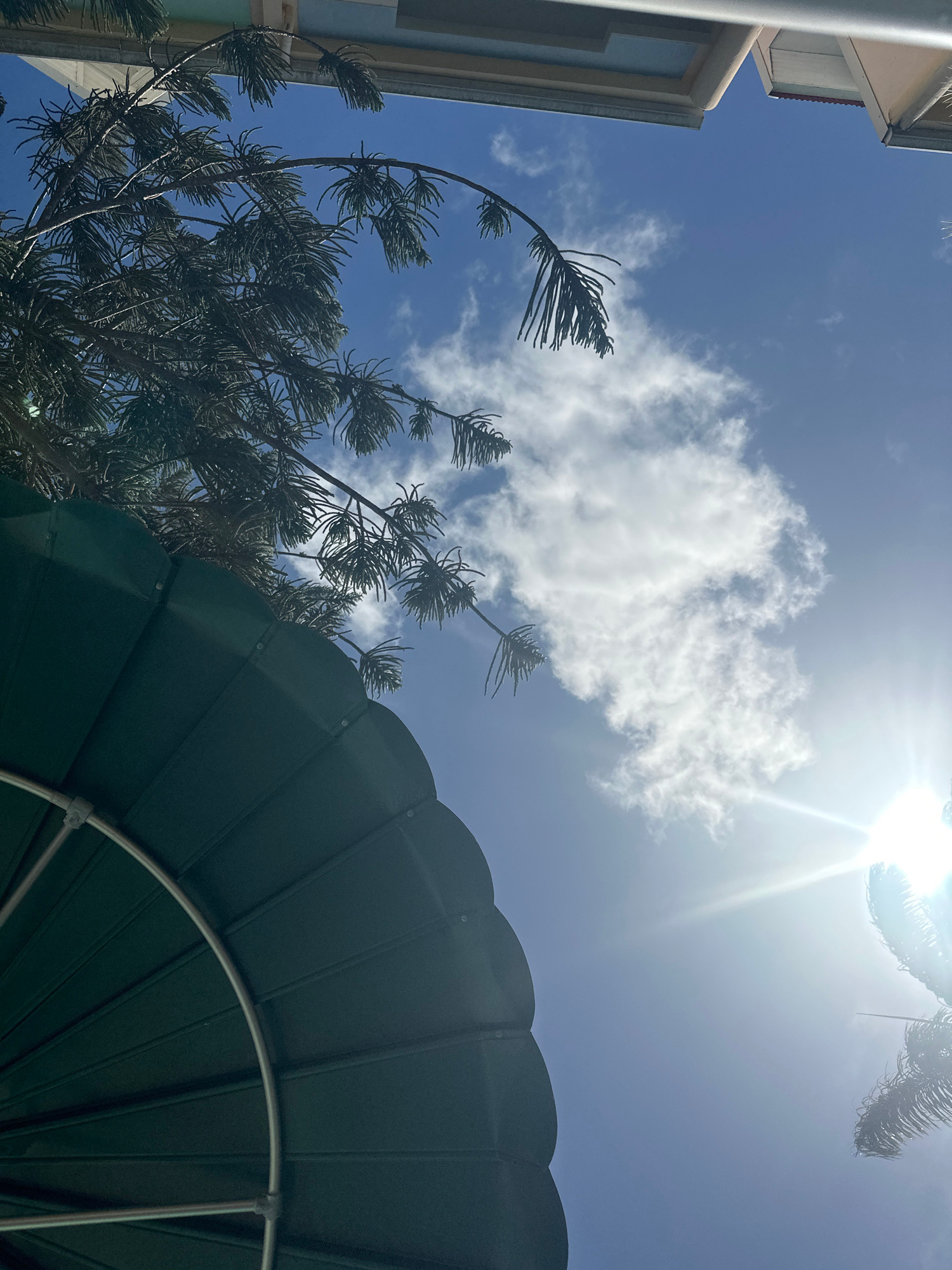 The image, taken from a low angle, features a bright sunny sky with a few white clouds. A building is visible on the left side of the frame. In the foreground is a dark green, circular awning or umbreβ¦read more