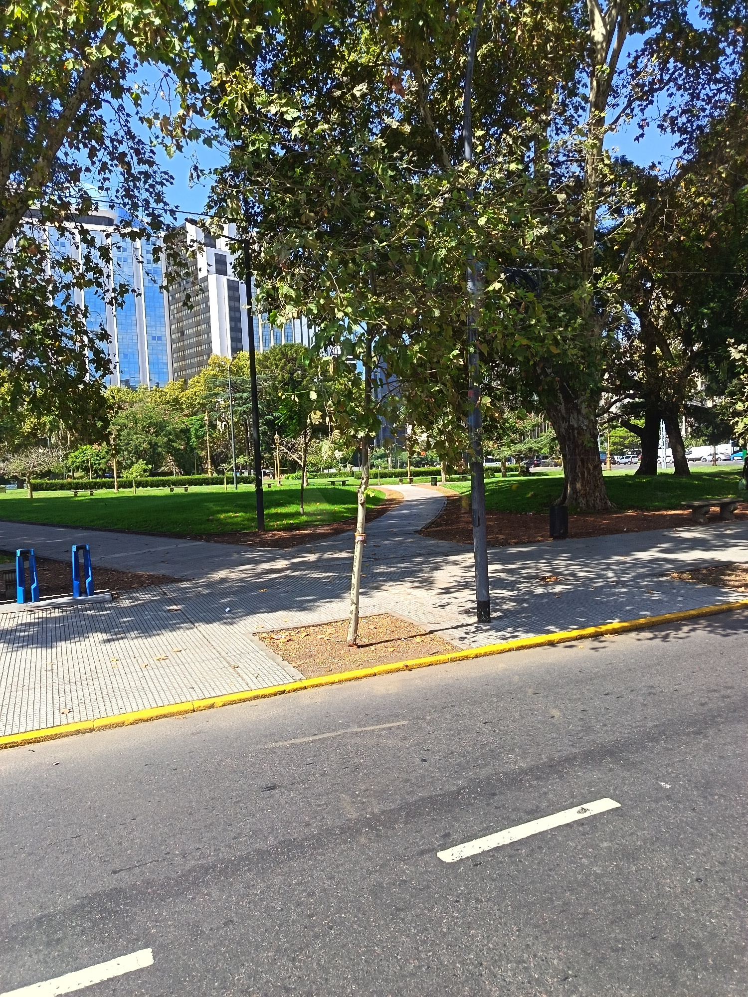 This image captures a street scene in Buenos Aires, Argentina. A paved street, marked with a white lane marking and edged with a yellow curb, is in the foreground. Beyond the street is a sidewalk made…read more