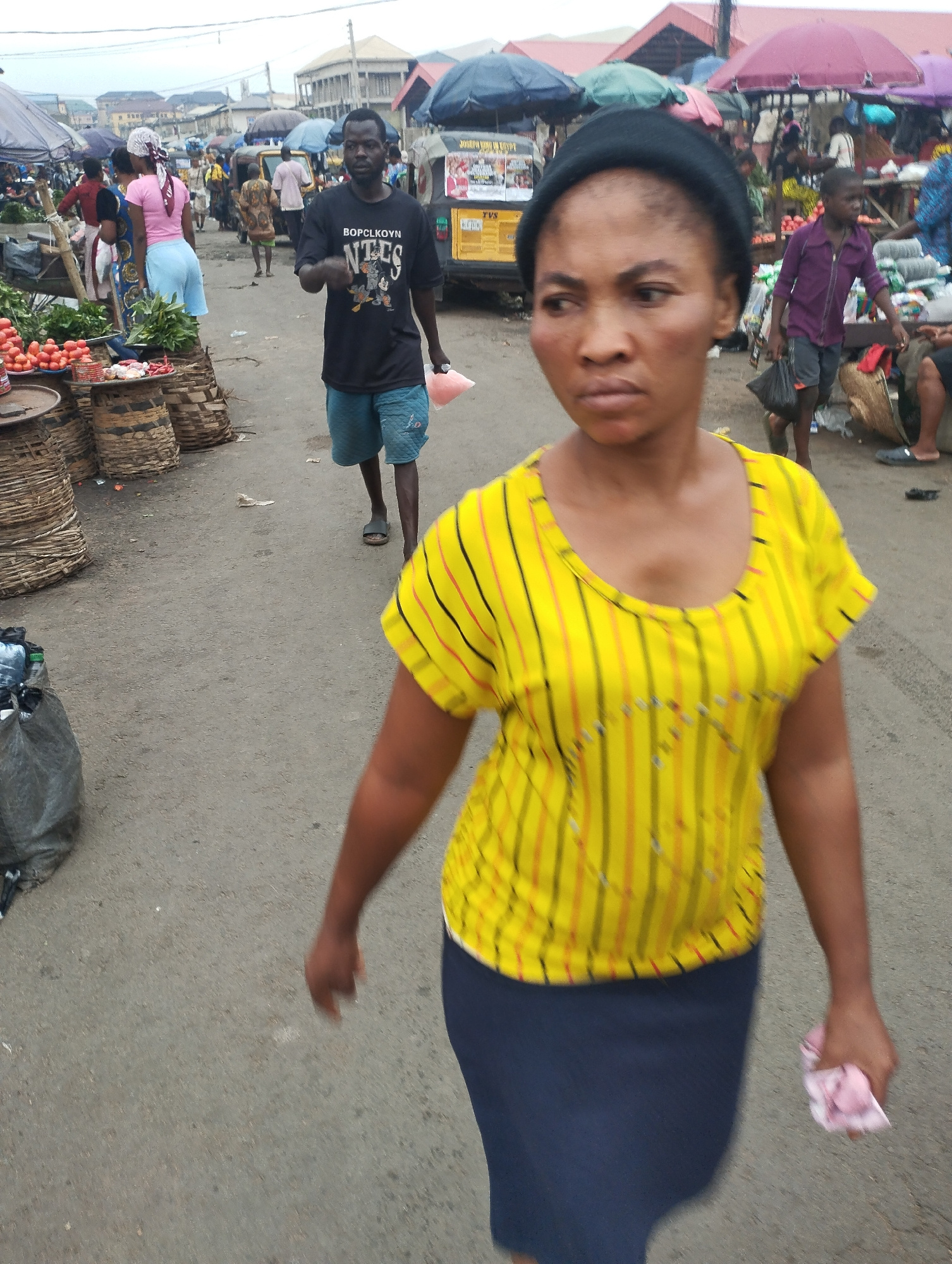The image captures a bustling market scene in Fegge, Nigeria. A woman in a yellow striped shirt and navy blue skirt walks towards the camera, holding a crumpled pink cloth in her hand. A man in a blac…read more