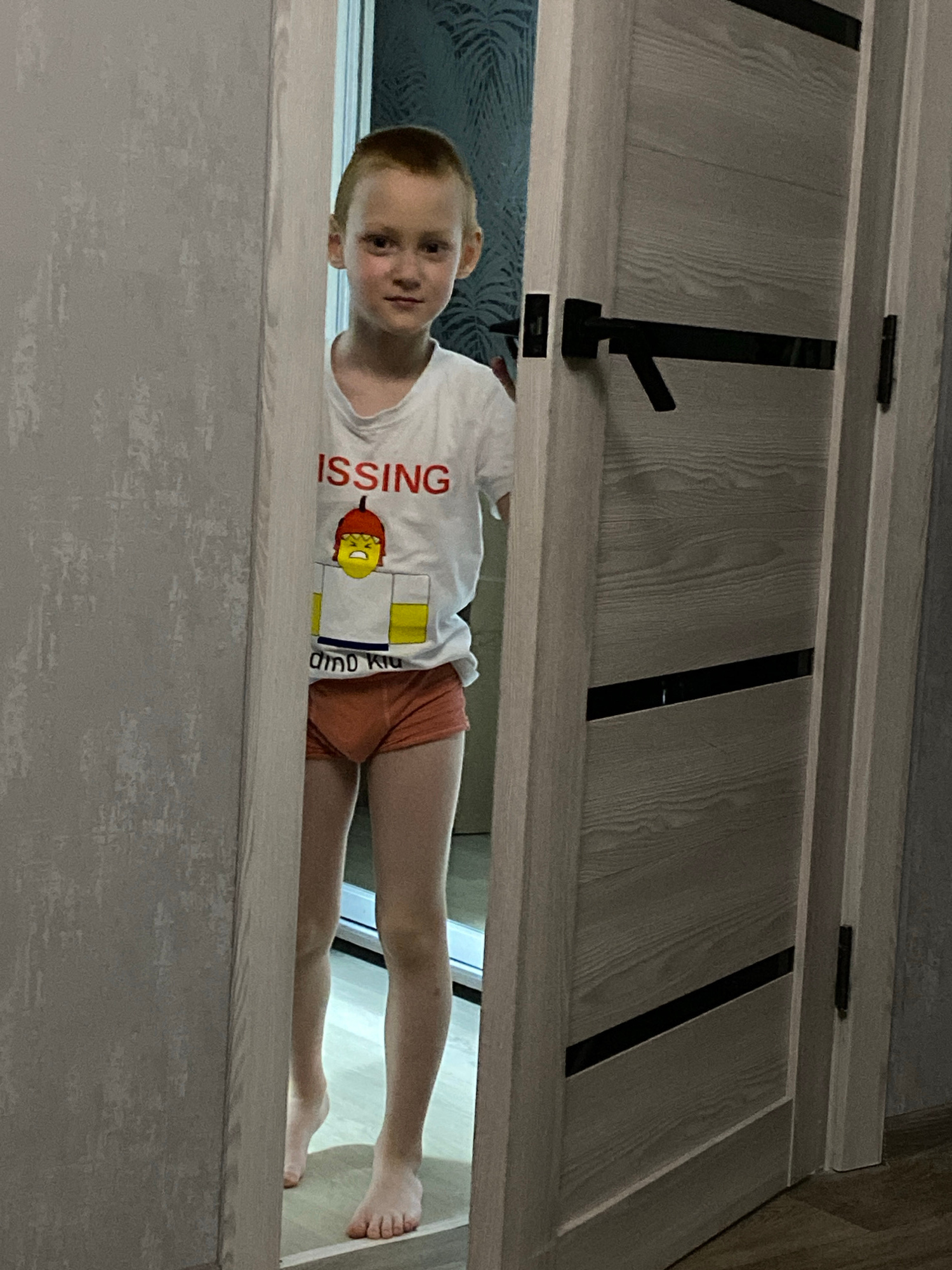 A young boy lies on the floor visible through the gap of a partially opened door. He is wearing a white t-shirt with a graphic of a Lego figure and the word "MISSING" on it, along with orange shorts.…read more