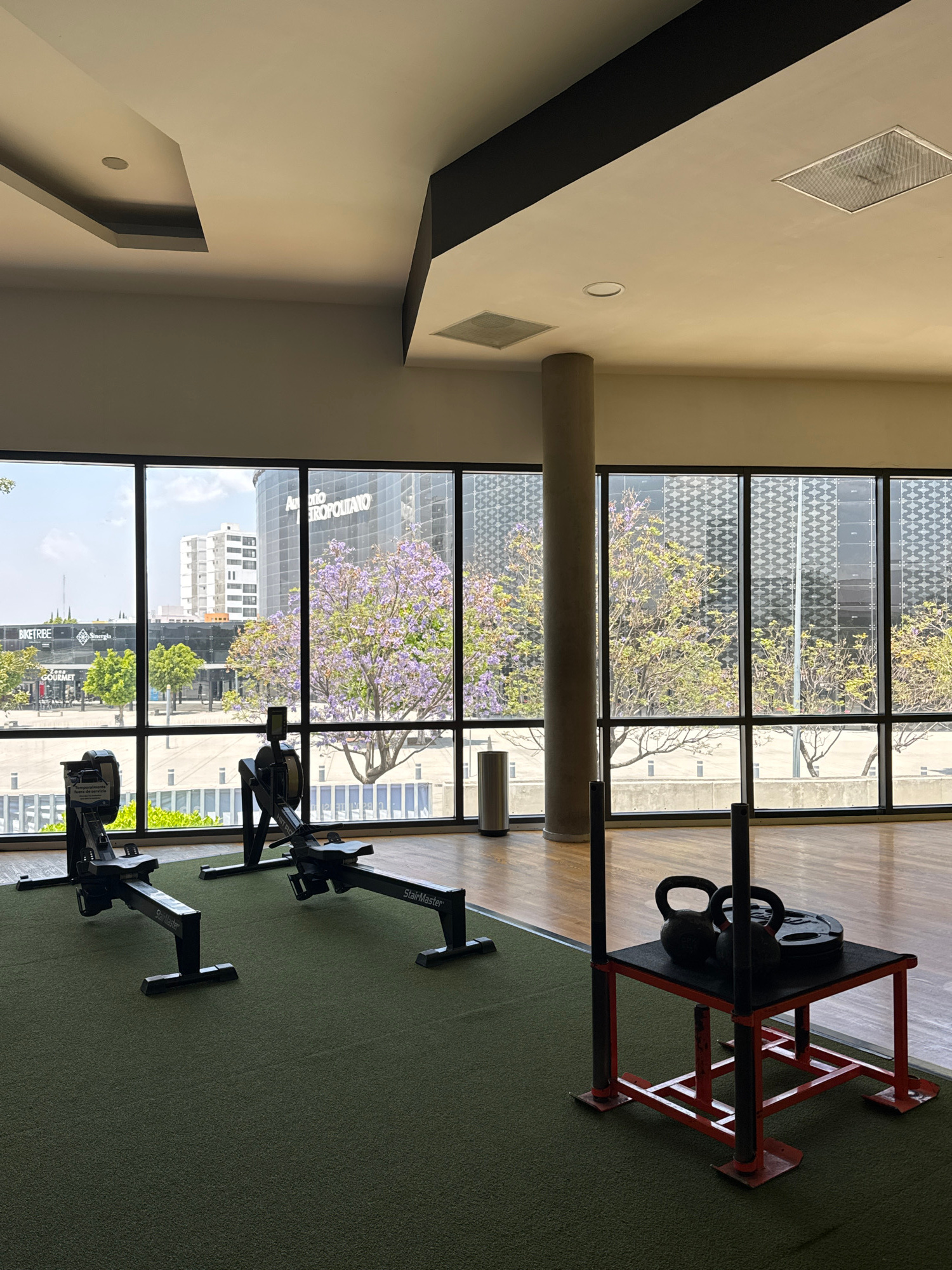 The image shows the interior of a gym. The walls are painted a light beige color. There is a triangular recessed section in the wall. There are large grid-patterned windows that look out onto a citysc…read more