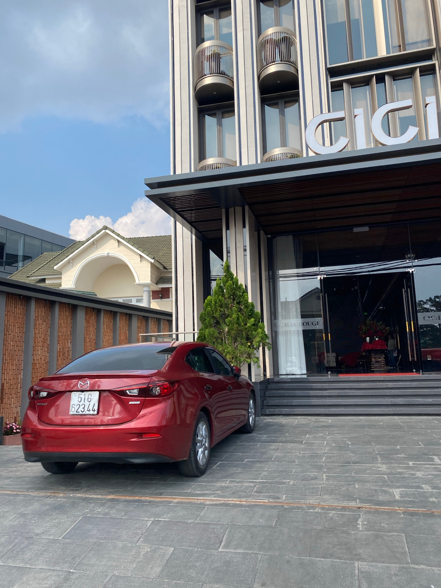 The image depicts a red Mazda parked on a grey stone-paved area in front of a building. The building features modern architecture with vertical metal strips and circular vents. The name "UDIC" is visiβ¦read more