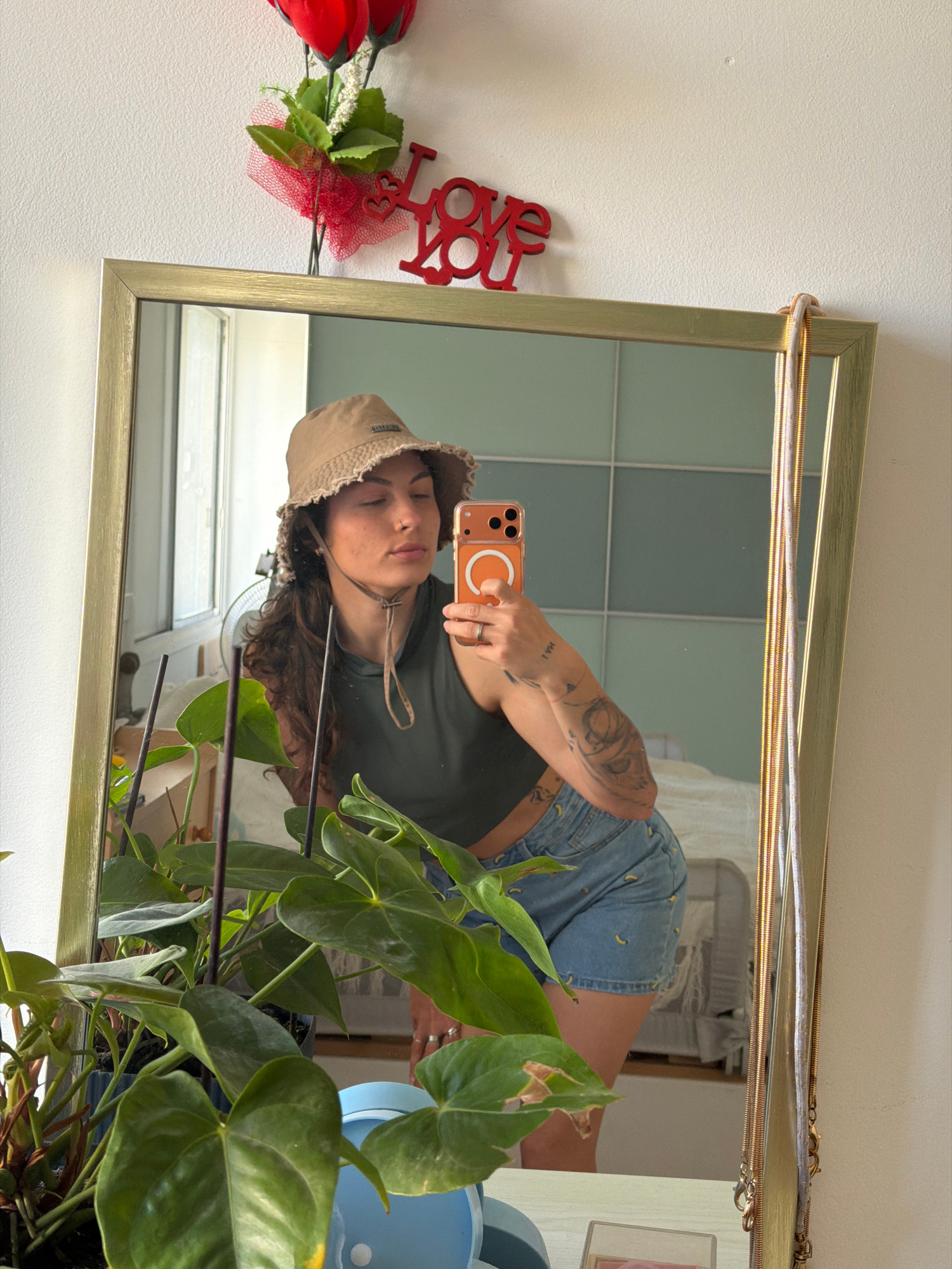 A reflection in a gold-framed mirror shows a woman with medium-length curly brown hair wearing a tan bucket hat, a dark green t-shirt, and blue jean shorts with yellow banana patterns. She is holding…read more