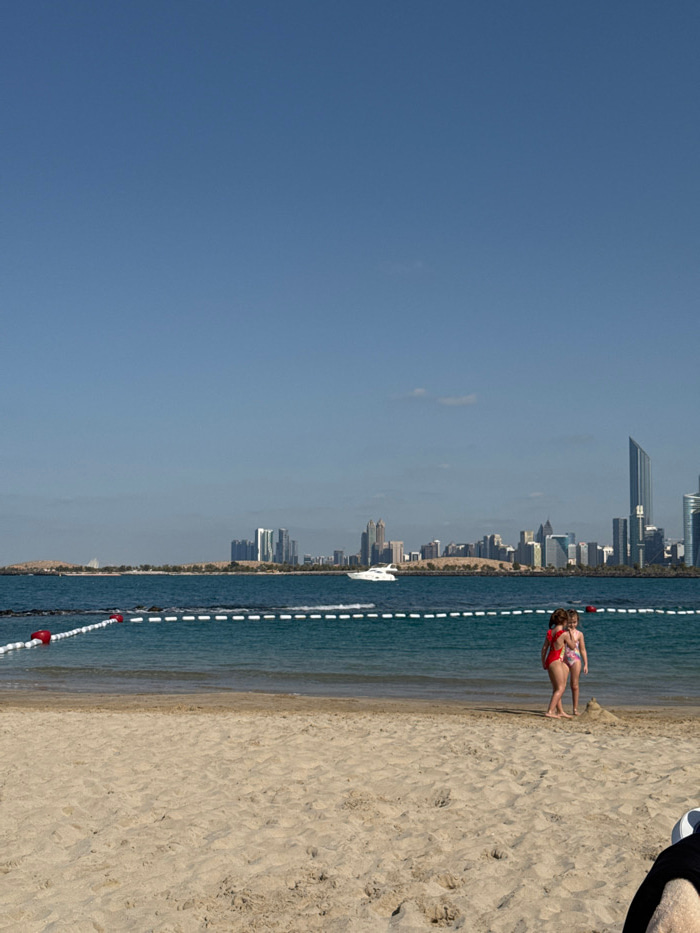 The image depicts a sunny beach scene in Abu Dhabi, United Arab Emirates. The view is from a sandy beach looking across a body of water towards the city's main island, identifiable by its prominent sk…read more