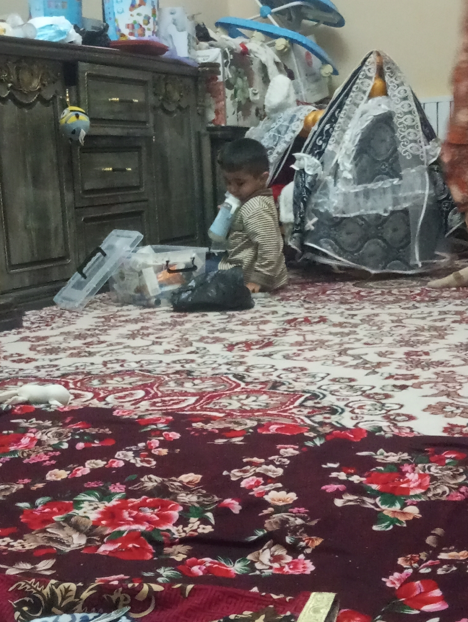 A young child is sitting on a patterned rug, drinking from a bottle. Beside the child is a clear plastic container with contents and a black bag. Behind the child is a structure draped with white laceβ¦read more