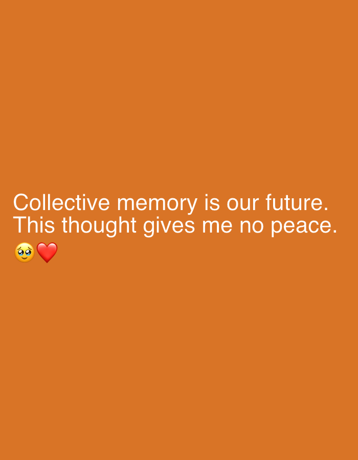 The image features white text displayed against a solid, bright orange background. The text reads: "Collective memory is our future. This thought gives me no peace." Below the second line of text, the…read more