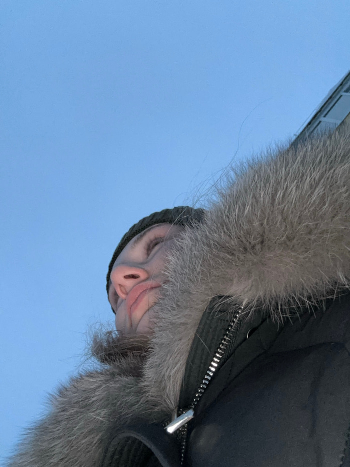 A person in a dark winter coat with a fur-lined hood faces downward. The background is a bright blue sky, with a partial building visible in the top left corner. The person wears a dark knit cap benea…read more