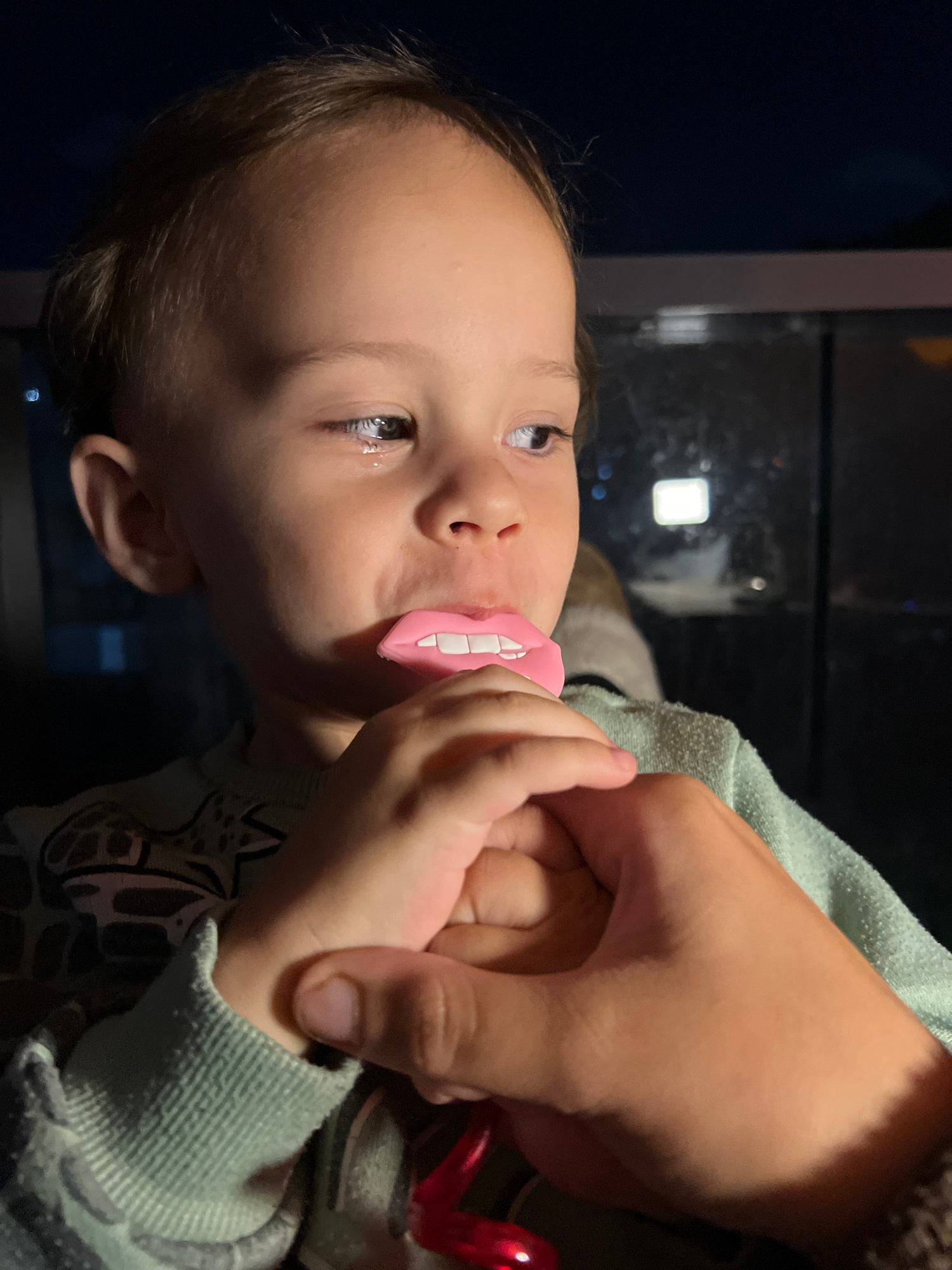 A young child is holding an adult's hand and holding a pacifier with fake teeth in their mouth. The child is wearing a green sweater. The background suggests an indoor location, possibly near a windowβ¦read more