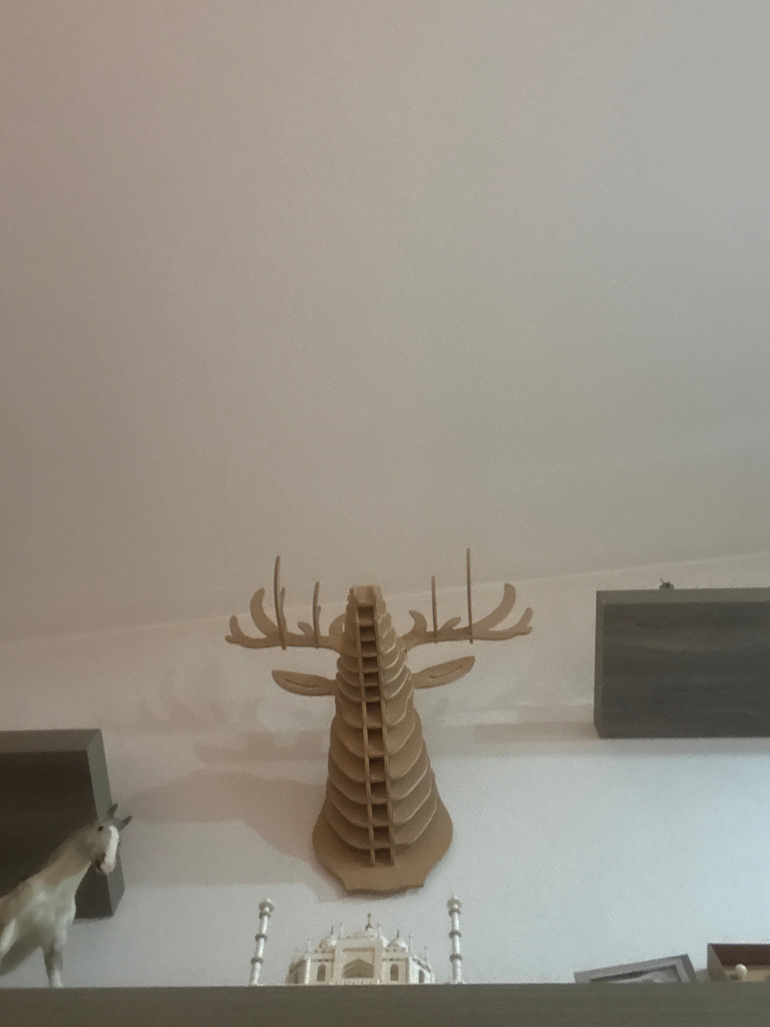 A sideways view of a wall featuring a wooden deer head decoration and a white goat figurine, possibly indoors, in Puebla, Mexico. The deer head is constructed of stacked, layered pieces of wood, creat…read more