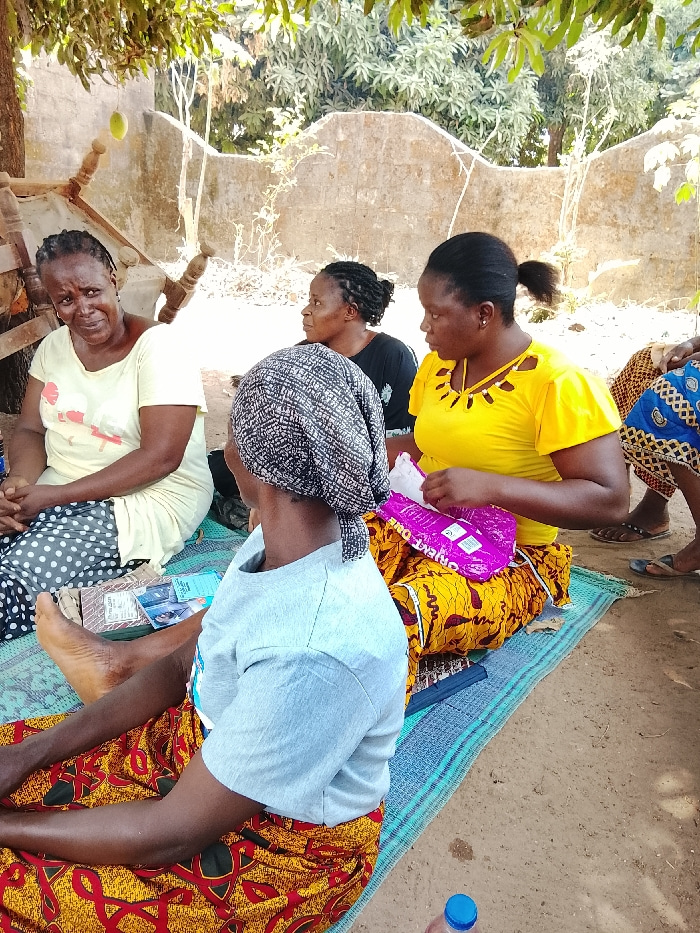 An outdoor scene in Akwanga, Nigeria, depicts five adult females seated on blue and green striped woven mats on a dirt ground under a tree. On the far left, an adult female with braided hair, wearingโฆread more