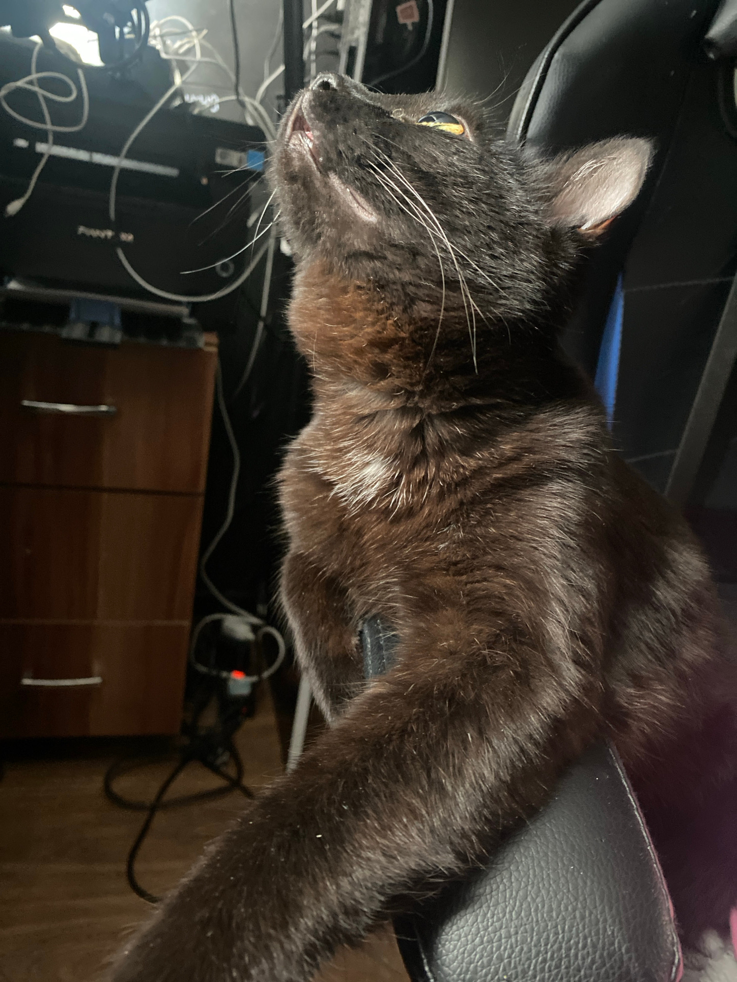 A medium shot depicts a black and brown cat resting on a black office chair. The cat's head is positioned towards the left side of the frame, with its body extending to the right. Below the cat and th…read more