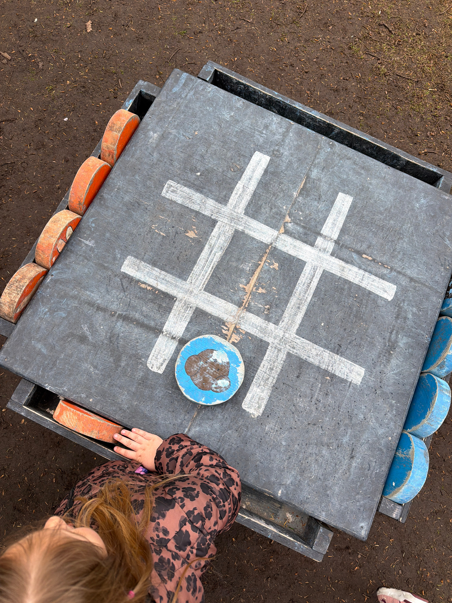 The image captures an outdoor tic-tac-toe game in what appears to be a recreational space. The game is played on a square, gray-surfaced structure marked with white lines creating the grid. One game p…read more