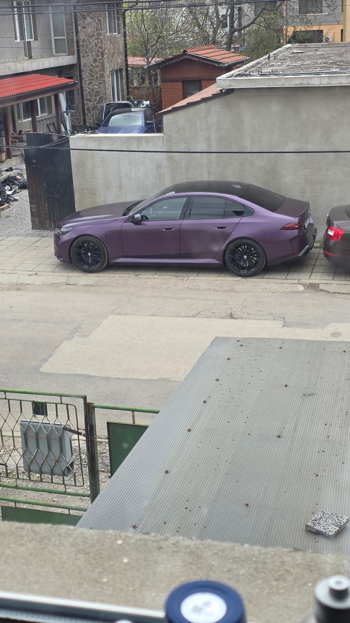 The image, which appears rotated, captures an elevated view of a residential area in Kazichene, Bulgaria, during daytime. The scene is dominated by a paved parking area or street, flanked by various b…read more