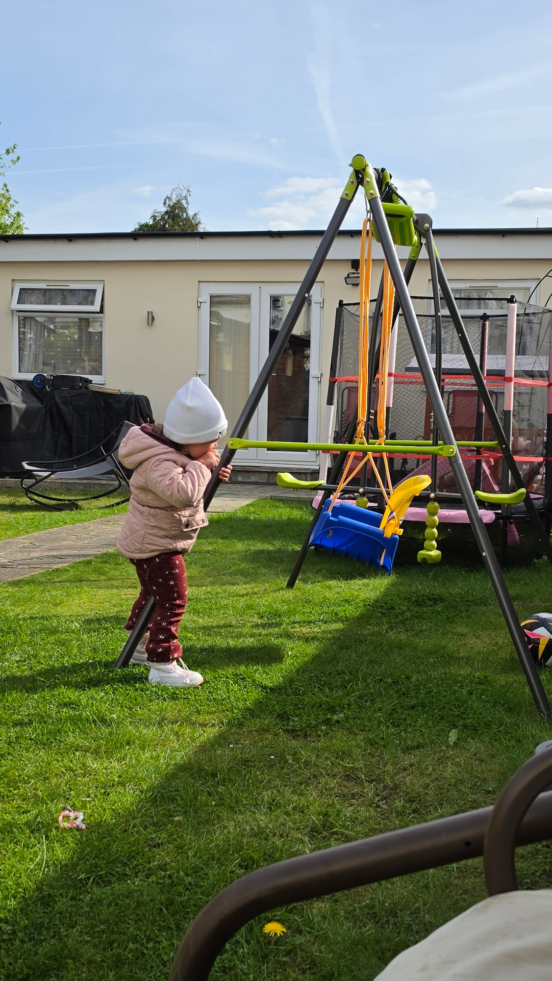 A toddler in a white hat, light pink quilted jacket, and dark red patterned pants is climbing on a black metal swing set in a grassy backyard. The swing set has a green and yellow top bar, orange stra…read more