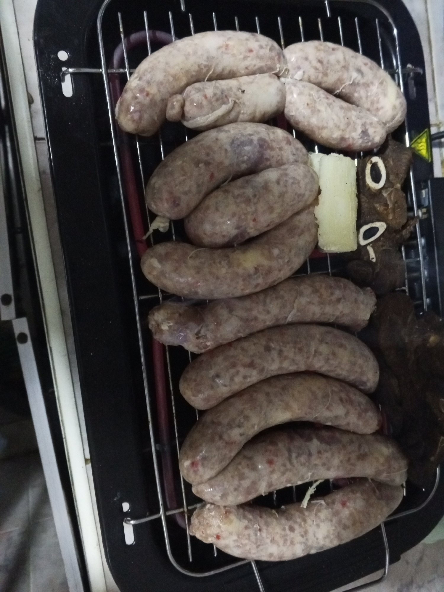 The image shows an electric grill with several sausages of varying shades of gray and a few pieces of dark-colored meat. Next to the meat appears to be a small piece of white cheese. The photograph wa…read more